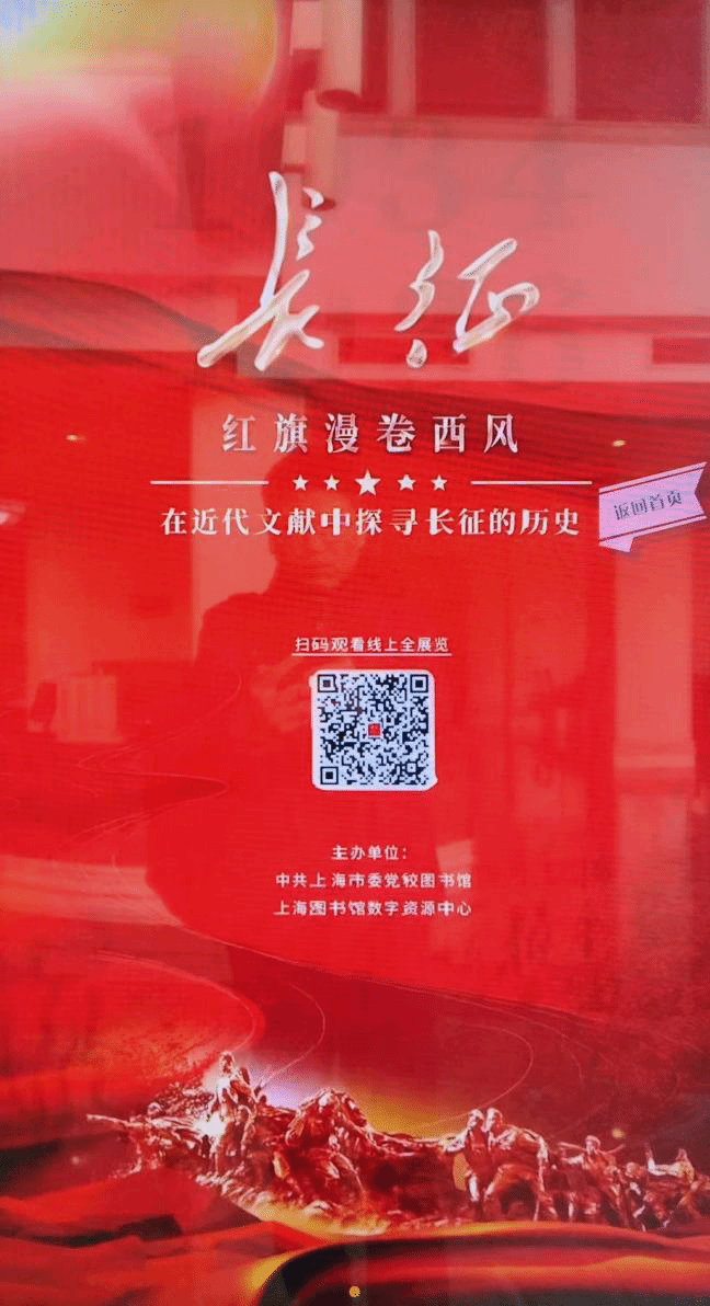 中共上海市委党校图书馆联合上海图书馆数字资源中心,在图书馆大厅、海华教学楼、海兴教学楼电子屏,梅陇校区1号楼,特别是“上海市委党校图书馆”微信公众号推出“红旗漫卷西风——在近代文献中探寻长征的历史”主题电子展。