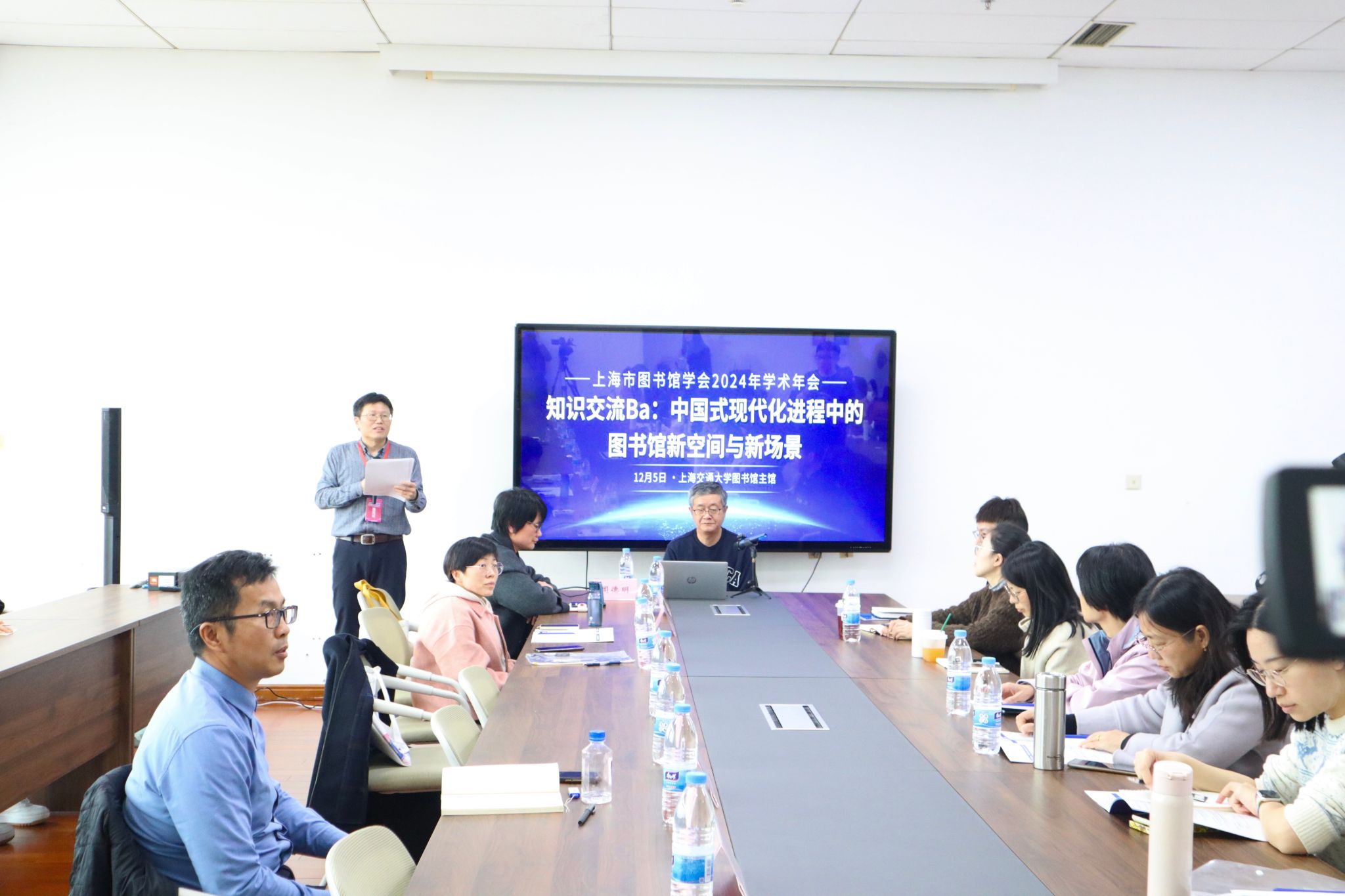 12月5日下午,上海市图书馆学会2024学术年会分会场在上海交通大学图书馆主馆三楼顺利举行。本次会议由上海市图书馆学会党校图书馆委员会和学术委员会新空间与新场景建设专业委员会联合举办,主题为“知识交流Ba:中国式现代化进程中的图书馆新空间与新场景”。中共上海市委党校图书馆馆长、上海市图书馆学会副理事长吴才唤主持,来自图书馆领域的专业技术人员共50余人参加会议。