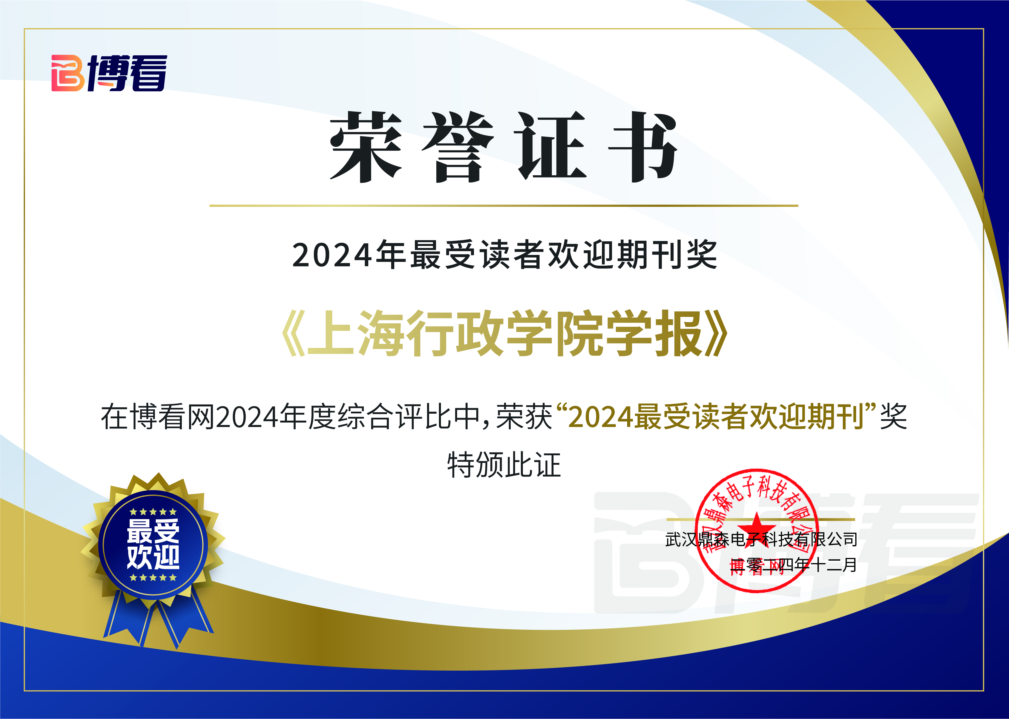 近日,博看网2024年度“最受读者欢迎期刊奖”揭晓,《上海行政学院学报》首度荣获该奖项。