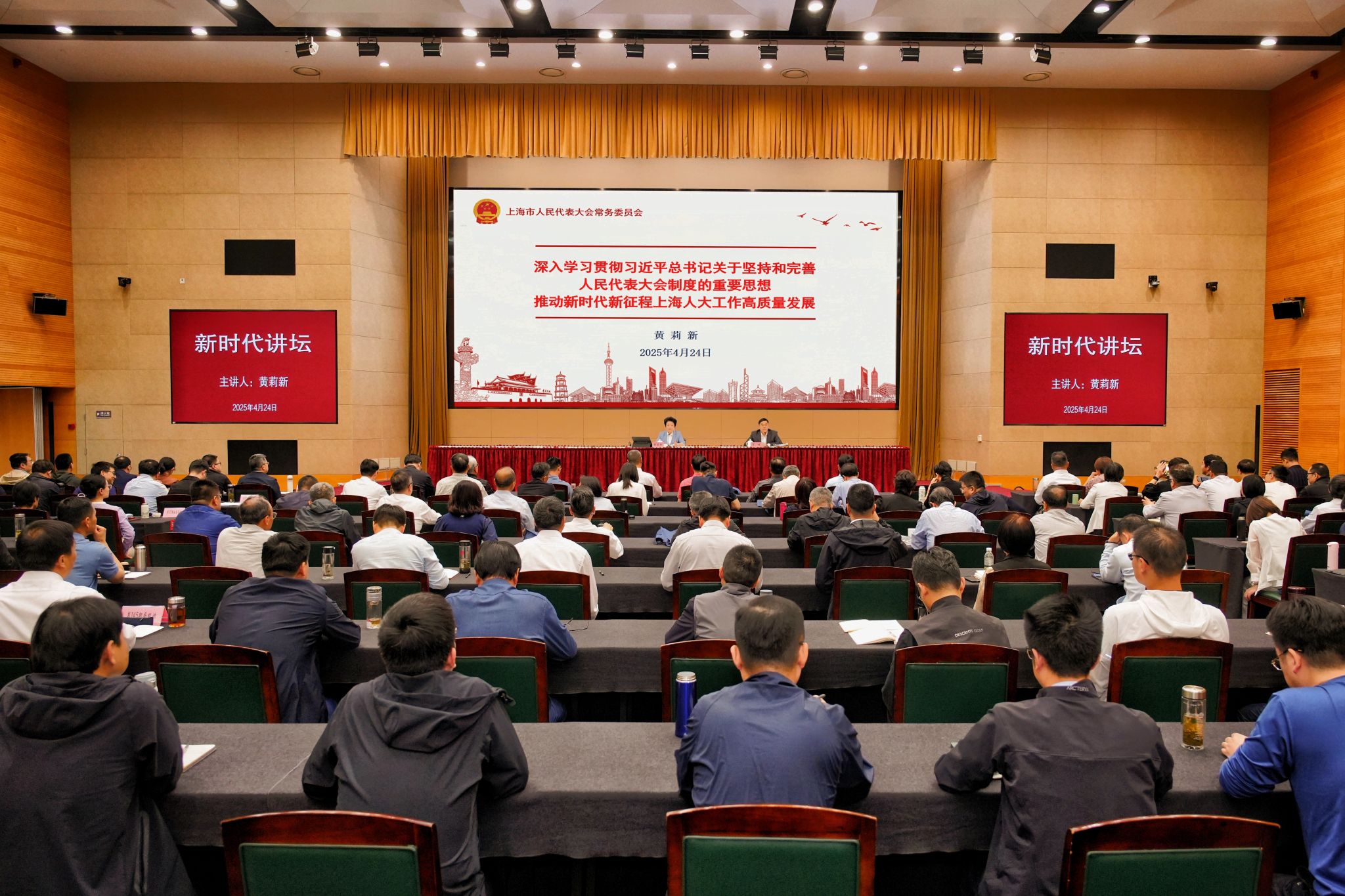 4月24日,市人大常委会主任黄莉新来校主讲新时代讲坛,作“深入学习贯彻习近平总书记关于坚持和完善人民代表大会制度的重要思想,推动新时代新征程上海人大工作高质量发展”专题报告。常务副校长曾峻主持。