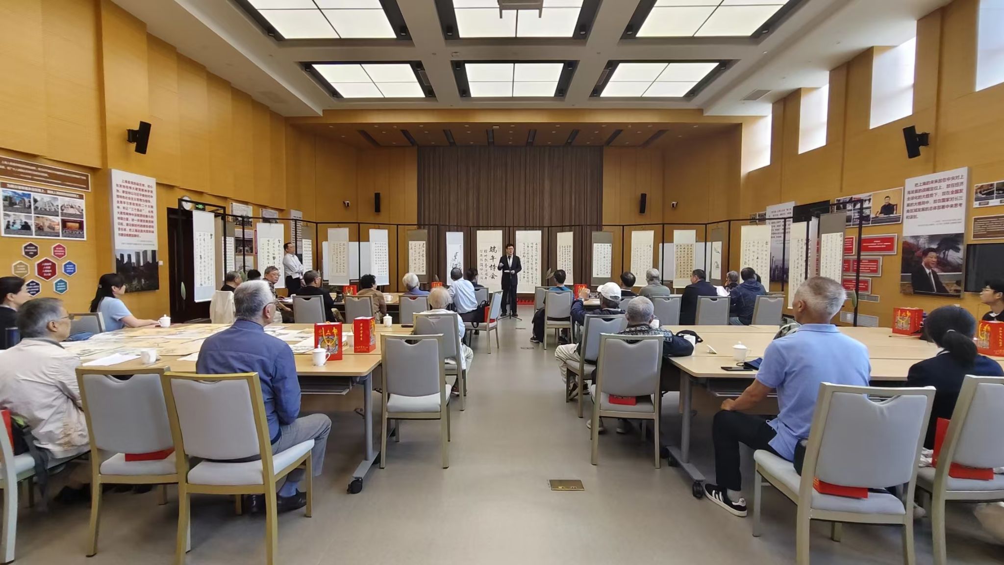 海中楼202室,“粽叶飘香迎端午 经典传诵咏流传”端午诗会正火热进行。涂晔祝贺离退休老干部“红潮”诗词社正式成立并致辞。他表示,诗词社以“红潮”为名,“红”是政治底色,体现党校姓党;“潮”体现党校人精神状态,不管到什么年龄、在什么职位,都是勇立潮头、紧跟时代浪潮。老同志们精神矍铄,声情并茂地诵读自己创作的诗词,字里行间饱含对党的忠诚、对祖国的热爱、对美好生活的赞美。老同志们自创的诗词和书法作品悬挂四周,笔锋刚劲、诗韵悠长,充分展现了党校人深厚的文化底蕴和矢志不渝的政治本色。习近平总书记指出,“中华优秀传统文化是中华民族的精神命脉,是涵养社会主义核心价值观的重要源泉。”此次诗会,既是党校人对传统文化的深情礼赞,更是对红色基因的接续传承。