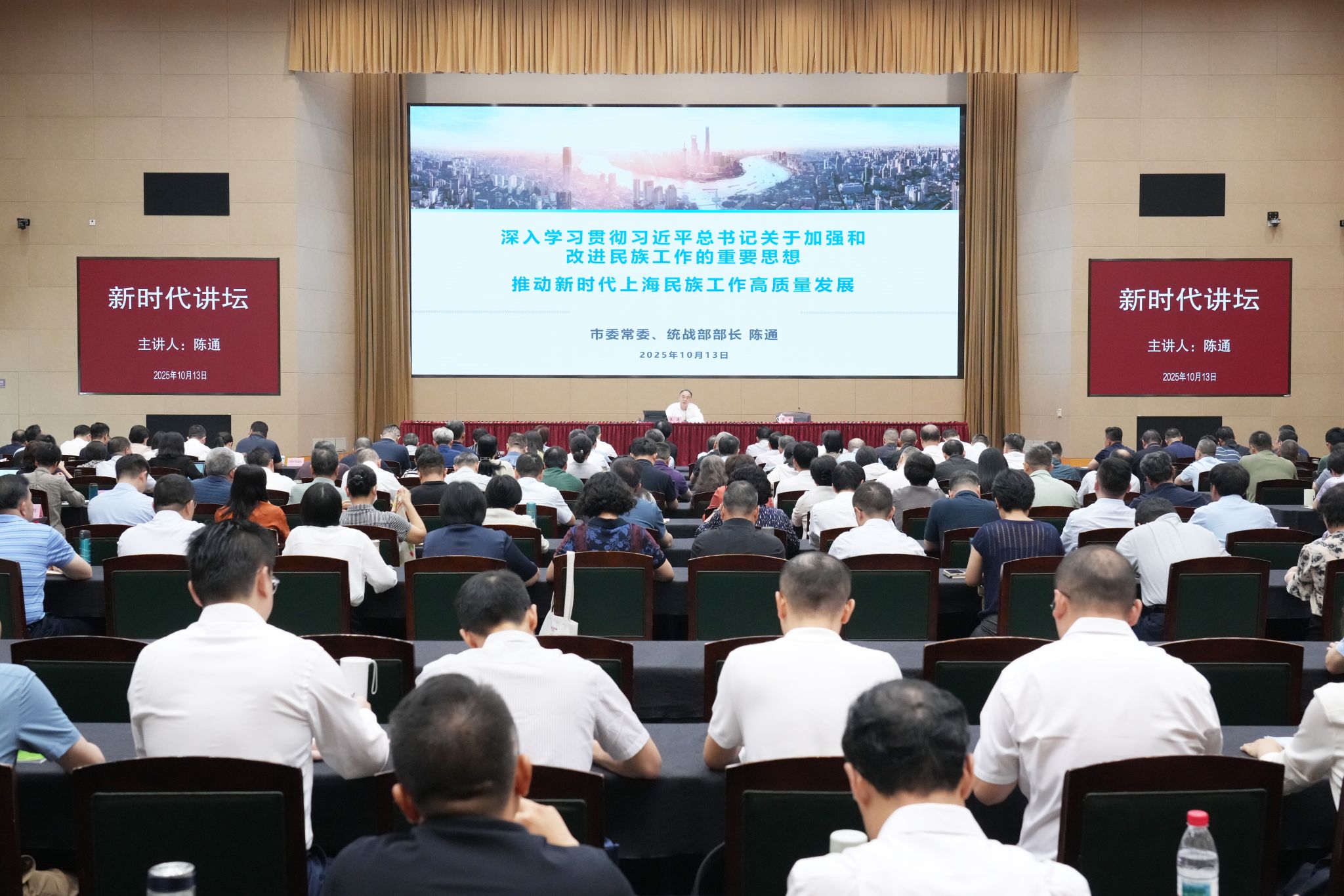 10月13日下午,市委常委、统战部部长陈通来校主讲新时代讲坛,作“深入学习贯彻习近平总书记关于加强和改进民族工作的重要思想 推动新时代上海民族工作高质量发展”专题报告。常务副校长曾峻主持。