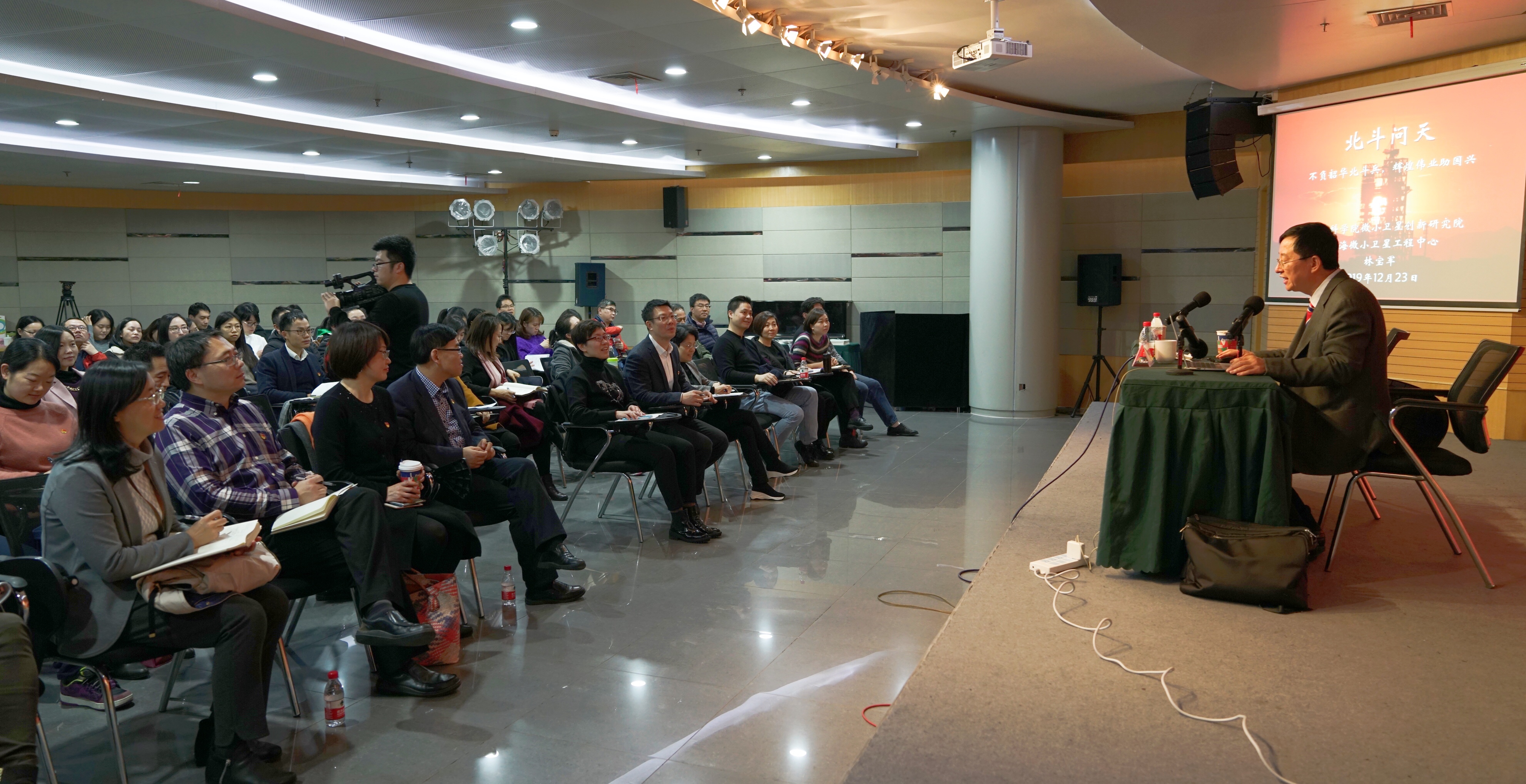 林宝军从自身的经历、中国的北斗世界的北斗、技术突破与创新几个方面展开汇报。