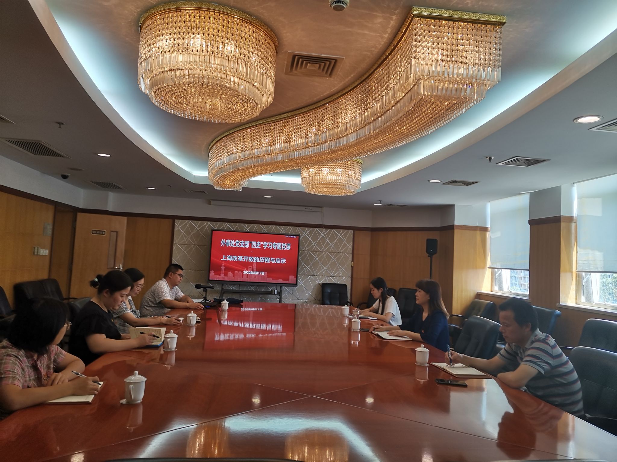 上午,按照机关党委要求,全体党员集中学习《习近平谈治国理政》第三卷并开展学习交流。支部书记刘登晓带领大家系统学习该书的框架体系,并精读了该书的开篇之作:《决胜全面建成小康社会 夺取新时代中国特色社会主义伟大胜利》(党的十九大报告)。党员们就之前开展自学的心得体会开展交流,并结合外事工作实际,全体党员分工诵读《习近平谈治国理政》第三卷第十六部分“深入推进中国特色大国外交”中的6篇文章。下午,徐辉为支部上题为“上海改革开放的历程与启示”的党课。党课以上海改革开放的历程为讲述对象,系统回顾了上海改革开放的大事件、大发展和历史进程,并总结其中的启示,显示了上海建设者在改革开放历程中“立足实际、敢为人先、担当责任、奋力前行”的精神内涵。
