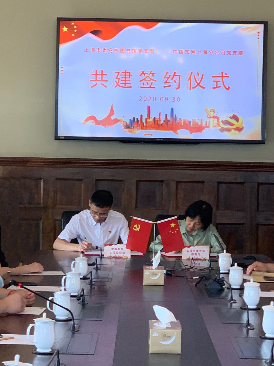 本网讯 为加强基层党支部建设、充分发挥党员的先锋模范作用,推进资源共享、优势互补、文明共建、共同发展,9月30日上午,校图书馆党支部与中国知网上海分公司党支部举行共建签约仪式,并开展主题为“行走滨江学‘四史’,感悟共产党人初心使命”的行走党课活动,活动邀请杨浦区委党校副教授李潇老师进行现场教学。