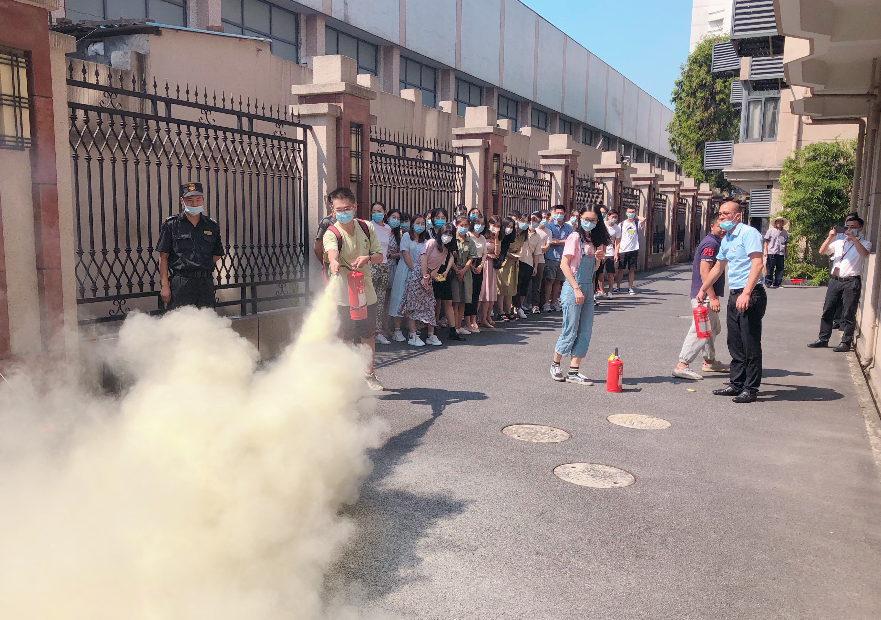 本网讯 9月4日上午,校后勤保卫处与研究生部合作,由上勤物业与宗保安保联合保障,为校2020级研究生开展入校安全教育培训。 课上,教官首先为学员们阐明研究生在读期间需严格遵守的校(院)安全规章制度、校内现有消防设施设备的操作使用方法及注意事项,接着为大家讲授预防火灾、火场逃生、火情处置等相关知识与技巧。讲授结束后,在宗保安保的保障下,同学们进行了灭火器灭火实训操演。课程内容丰富,简明实用,节奏紧凑,精彩纷呈,同学们专心听讲,积极互动,取得了预期的教学效果。