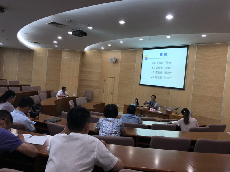 本次专题学习特邀公共管理教研部王扬老师为大家进行宪法学习专题辅导。王扬老师从宪法是信仰、宪法是权威、宪法是过程、宪法是仪式等四个方面,对宪法的实施与修订历史、学习宪法对领导干部提升自身素养的作用进行了生动、系统的讲解。