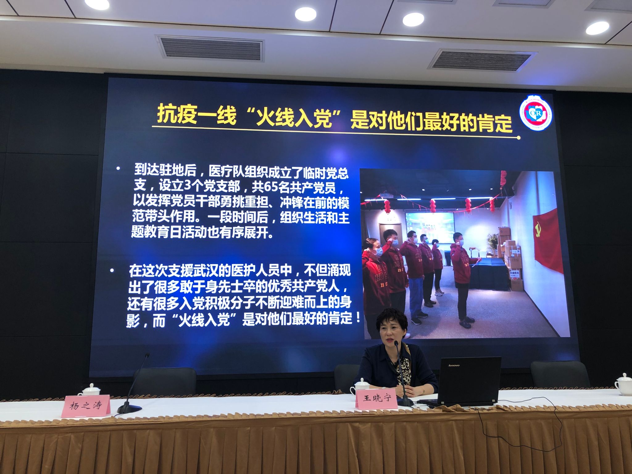 本网讯 7月6日上午,瑞金医院援鄂抗疫医疗队专家手术室护士长王晓宁,医务一处副处长、感染病学专家杨之涛来我校,讲授了一场主题为“抗疫者的初心”的党课,研究生部党支部、公共管理教研部党支部、校刊编辑部党支部、外事处党支部、图书馆党支部等五个支部60余名党员参加了党课学习,讲座通过腾讯会议向疫情在家的研究生同步直播。