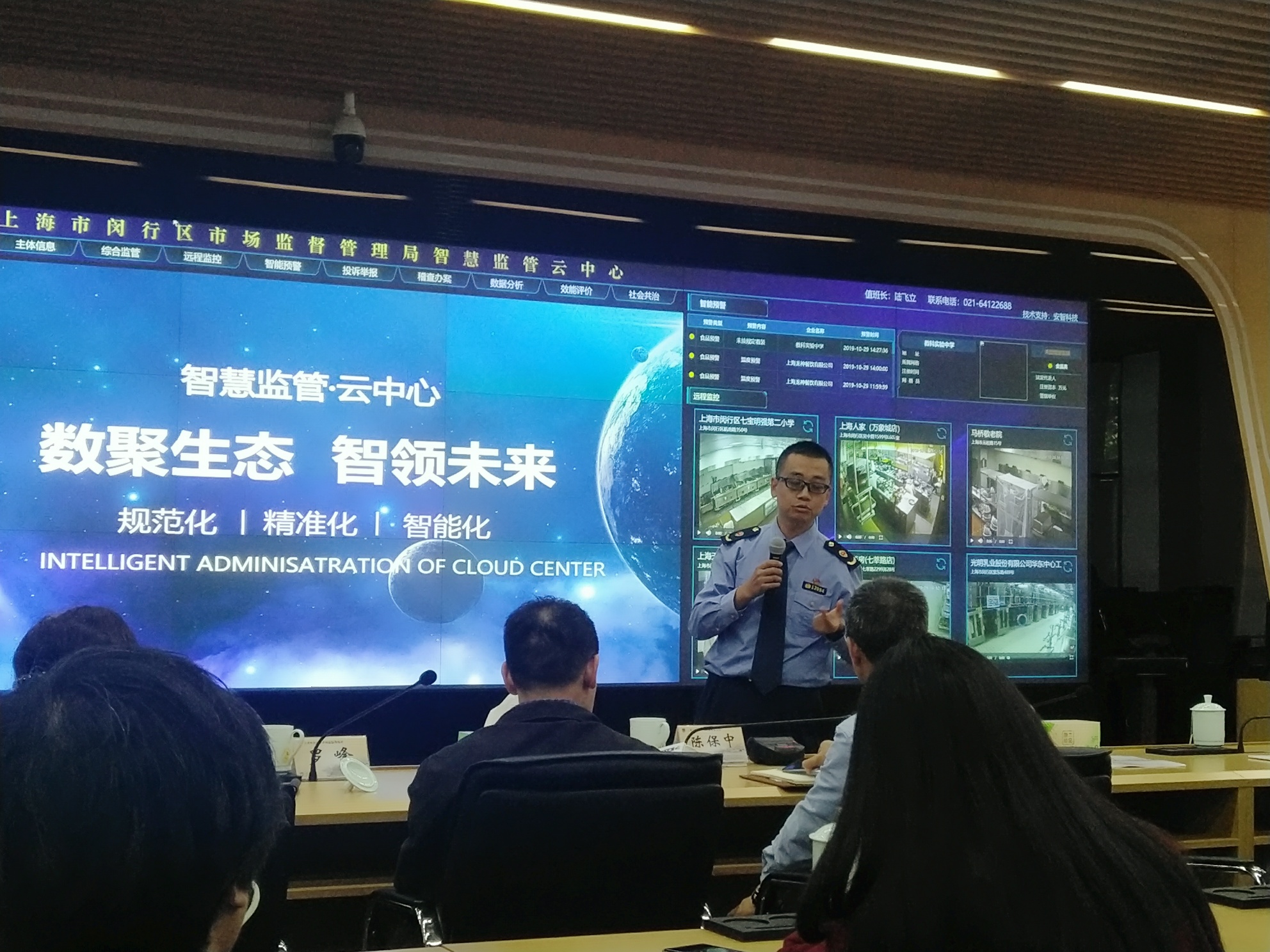 活动首先由云中心工作同志对云中心的具体运作进行了详细的介绍。该智能监管系统包括了主体信息、应急指挥、综合监管、远程监控、智能预警、投诉举报、稽查办案等多个功能模块,充分运用技术手段实现了对相关领域和行业的全方面、有层次的监管,同时实现监管预判,能提前进行相应的执法准备,体现了智能化治理的新动态。介绍后,云中心负责人与两个支部的党员们围绕活动主题进行了交流,主要讨论了工作效率、设备建设和维护、与相关企业的合作、法律困境等问题。
