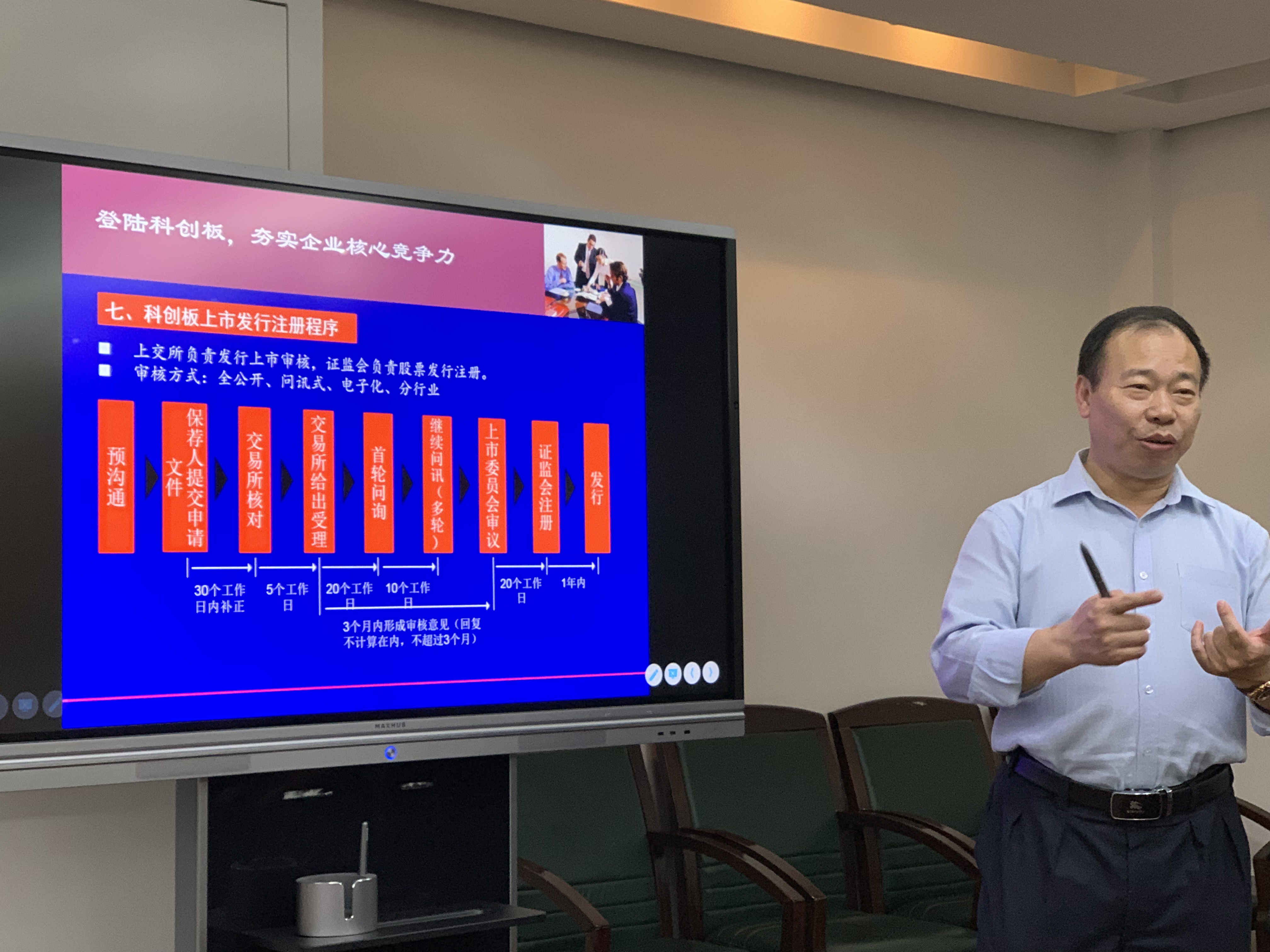 顾月明主任报告的题目是《登陆科创板,夯实企业核心竞争力》。报告分两部分,第一部分介绍了科创板设立的时代背景,科创板对标企业的特点,企业科创属性的评判依据和硬科技的评判主体,科创板上市发行的条件、规则、注册程序、定价方式、承销方式,最后总结了科创板交易制度设计特点和持续监管,以及初期形势;第二部分从工作机制,市区两级政府在资金、协调沟通方面的政策,中小企业上市促进中心的系列服务活动等方面梳理了政府推进企业改制上市的举措。