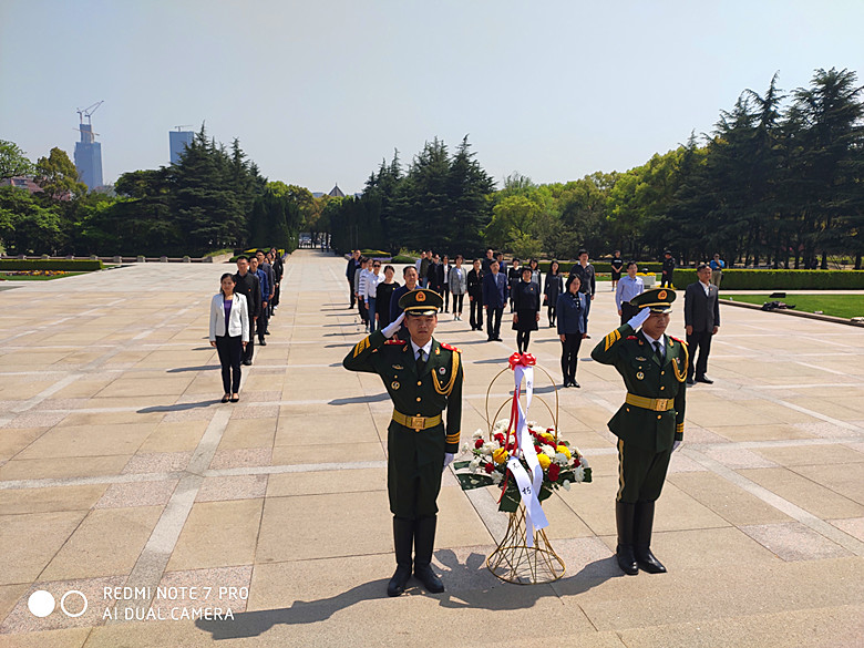 龙华烈士陵园内青松翠柏挺立,绿草如茵,雕塑神圣庄严,环境幽静肃穆。党员们抬着花篮,在工作人员带领下,怀着对革命先烈的崇敬之情,列队走到了纪念碑前,敬献花篮,鞠躬默哀。