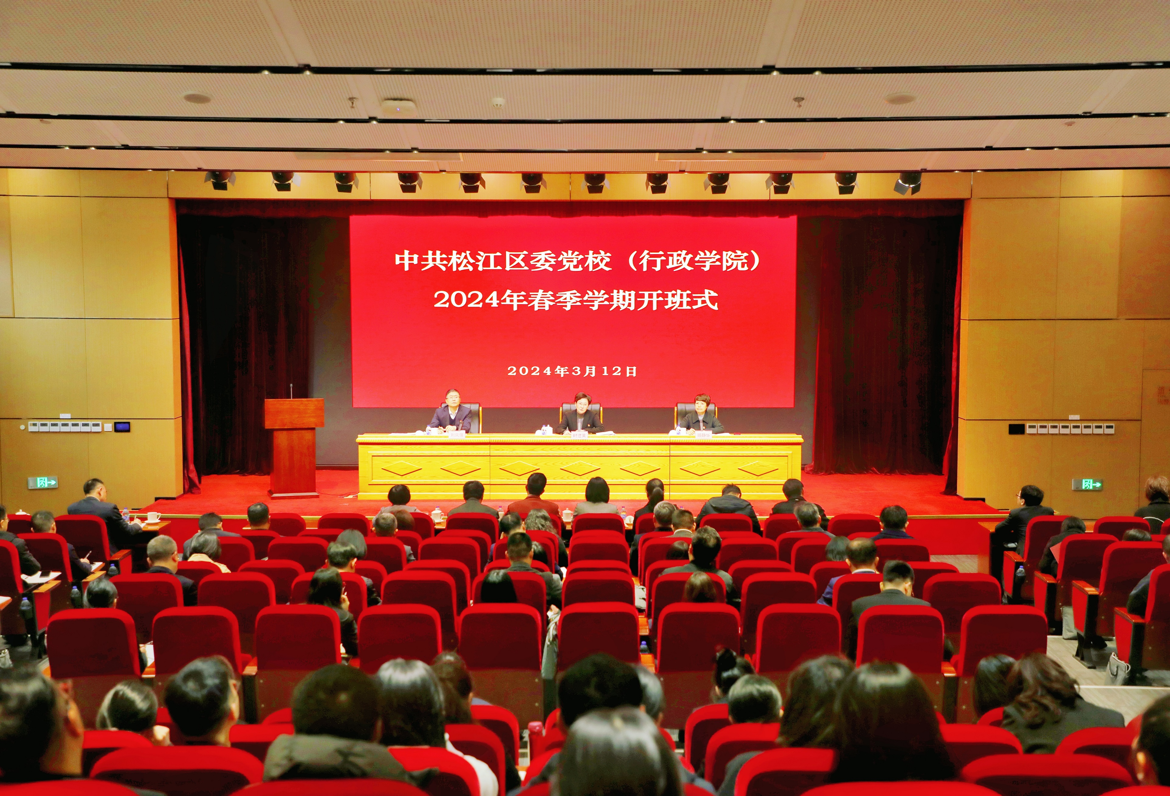 松江区2023—2027干部教育培训规划第四期处级干部轮训班、第十九期青年干部培训班、2024年第一期新提任科级干部培训班全体学员,以及松江区委党校(行政学院)全体教职员工参加开班式。