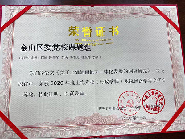 本网讯 11月24日,上海市委党校(行政学院)主办“构建新发展格局与‘十四五’高质量发展”研讨会。金山区委党校课题组撰写的《关于上海浦南地区一体化发展的调查研究》荣获2020年度上海党校(行政学院)系统经济学年会一等奖。青年教师唐珂撰写的《探索新时代上海沪郊农村集体经济发展新格局》荣获二等奖。