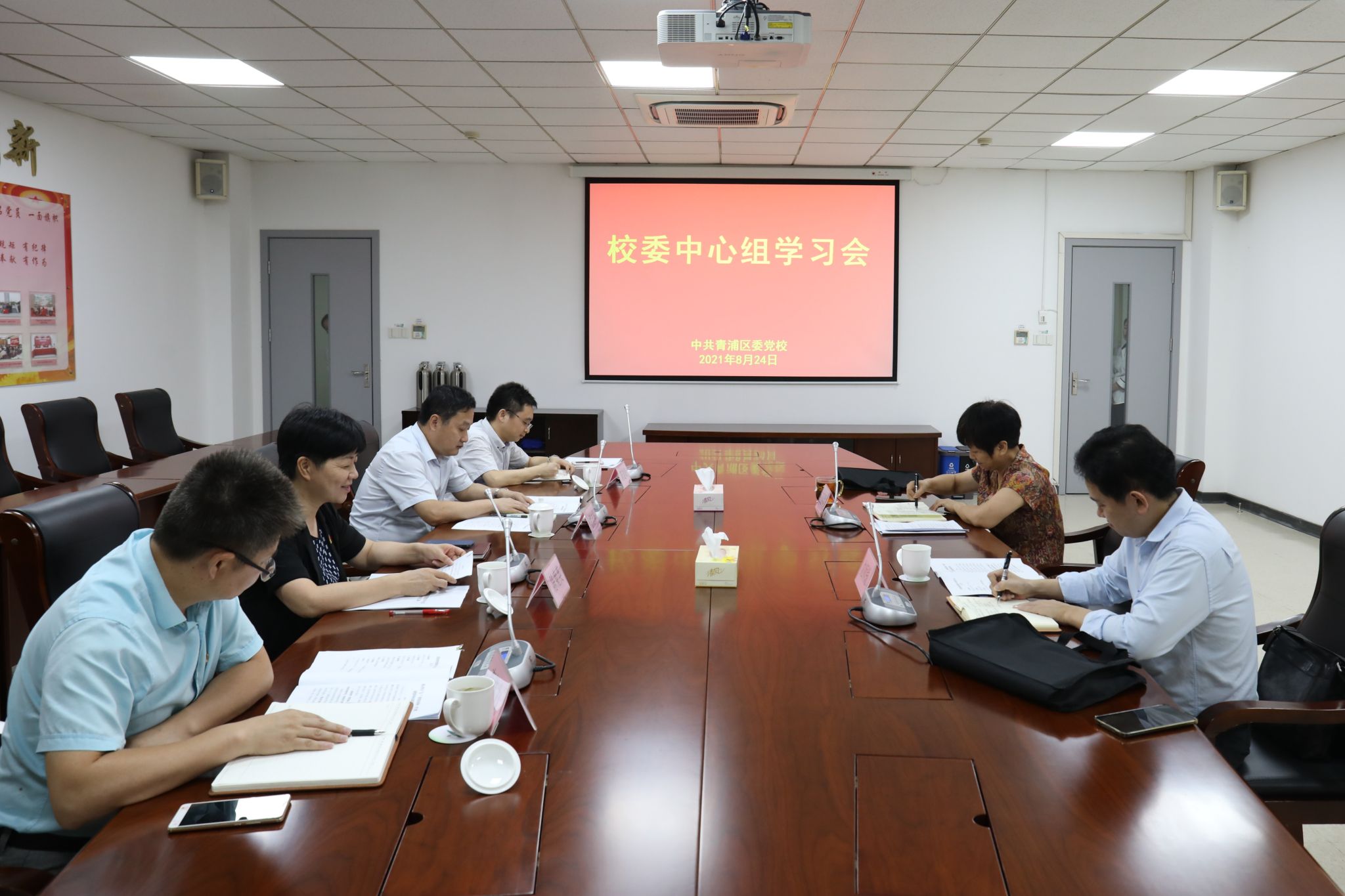本网讯 8月24日上午,青浦区委党校召开校委中心组理论学习会。区委党校常务副校长陈菊英主持,区委党史学习教育第三巡回指导组副组长王丽霞、组员沈师钱列席指导。
