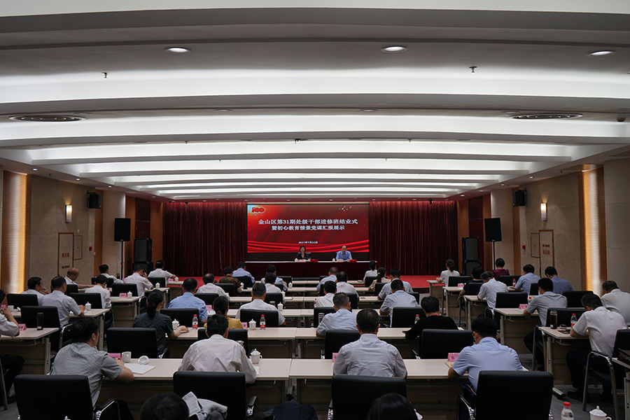 本网讯 7月22日下午,金山区第31期处级干部进修班结业式暨初心教育情景党课在区会议中心顺利举行。金山区委组织部副部长蒋雅红出席并讲话,区委党校常务副校长孙秀强主持会议。
