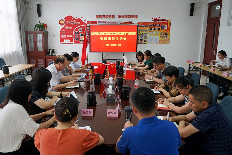 本网讯 7月16日上午,围绕“学党史、悟思想、办实事、开新局”主题和“学史明理、学史增信、学史崇德、学史力行”要求,金山区委党校党支部召开党史学习教育专题组织生活会,认真学习贯彻习近平总书记“七一”重要讲话精神,交流心得体会,查找差距不足,明确整改措施。常务副校长孙秀强、副校长郜工农、副校长刘娥苹以及全体党员参加会议。