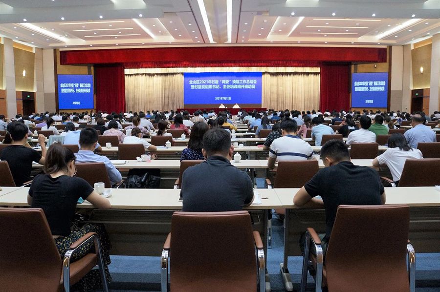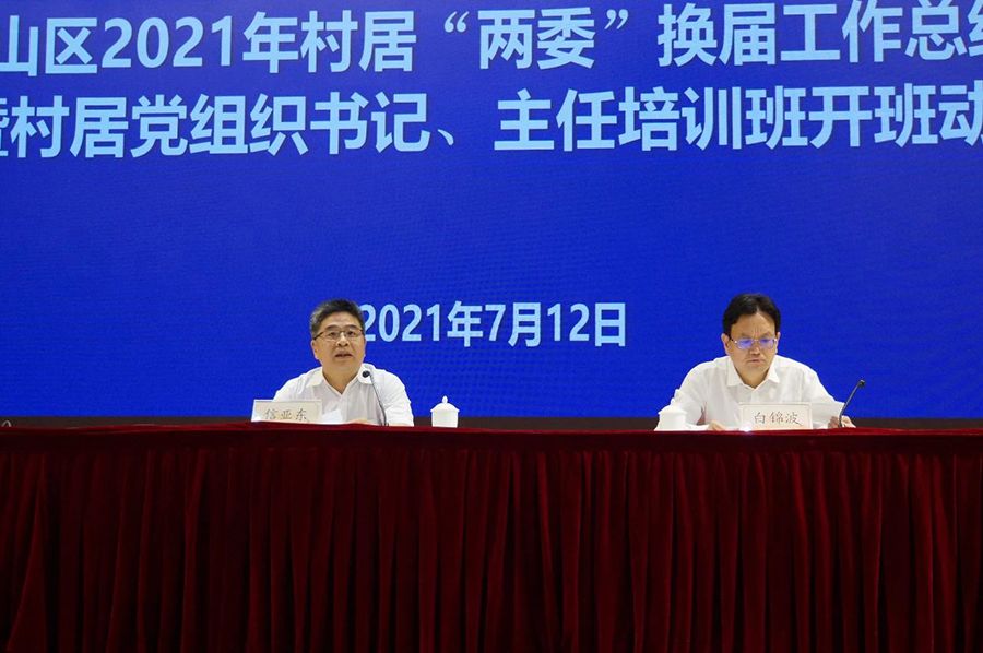本网讯 7月12日上午,为总结区2021年村居“两委”换届工作,落实新一届村居党组织书记培训的相关工作要求,扎实推进党史学习教育,金山区召开2021年村居“两委”换届工作总结会暨村居党组织书记、主任培训班开班仪式。区委副书记、区村居“两委”换届工作领导小组常务副组长信亚东出席会议并讲话,区委常委、组织部部长、区村居“两委”换届工作领导小组副组长白锦波主持会议并作村居换届工作总结。区委组织部分管负责人、区委党校、区民政局、区农业农村委主要负责人,区村居“两委”换届工作领导小组成员单位分管负责人,各街镇(工业区)党委(党工委)分管副书记,金山区第二批驻村指导员,新一届村居党组织书记、村居委会主任等370余人参加会议。