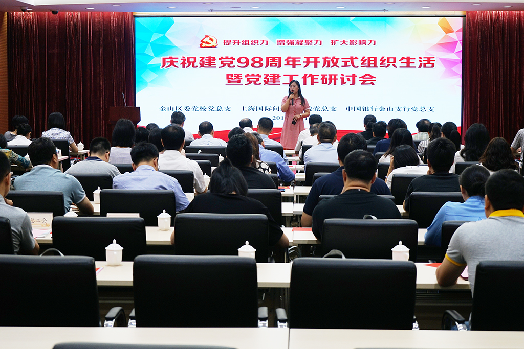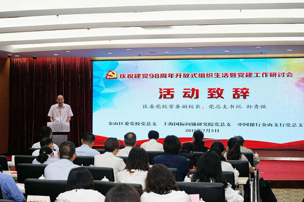 本网讯 为庆祝中国共产党成立98周年,进一步学习贯彻落实《中国共产党支部工作条例》和《中国共产党党员教育管理工作条例》精神,7月5日,由金山区委党校党总支、上海国际问题研究院党总支、中国银行金山支行党总支主办的“庆祝建党98周年开放式组织生活暨党建工作研讨会”在区会议中心5105室召开。区委党校常务副校长、党总支书记孙秀强代表主办单位作活动致辞。