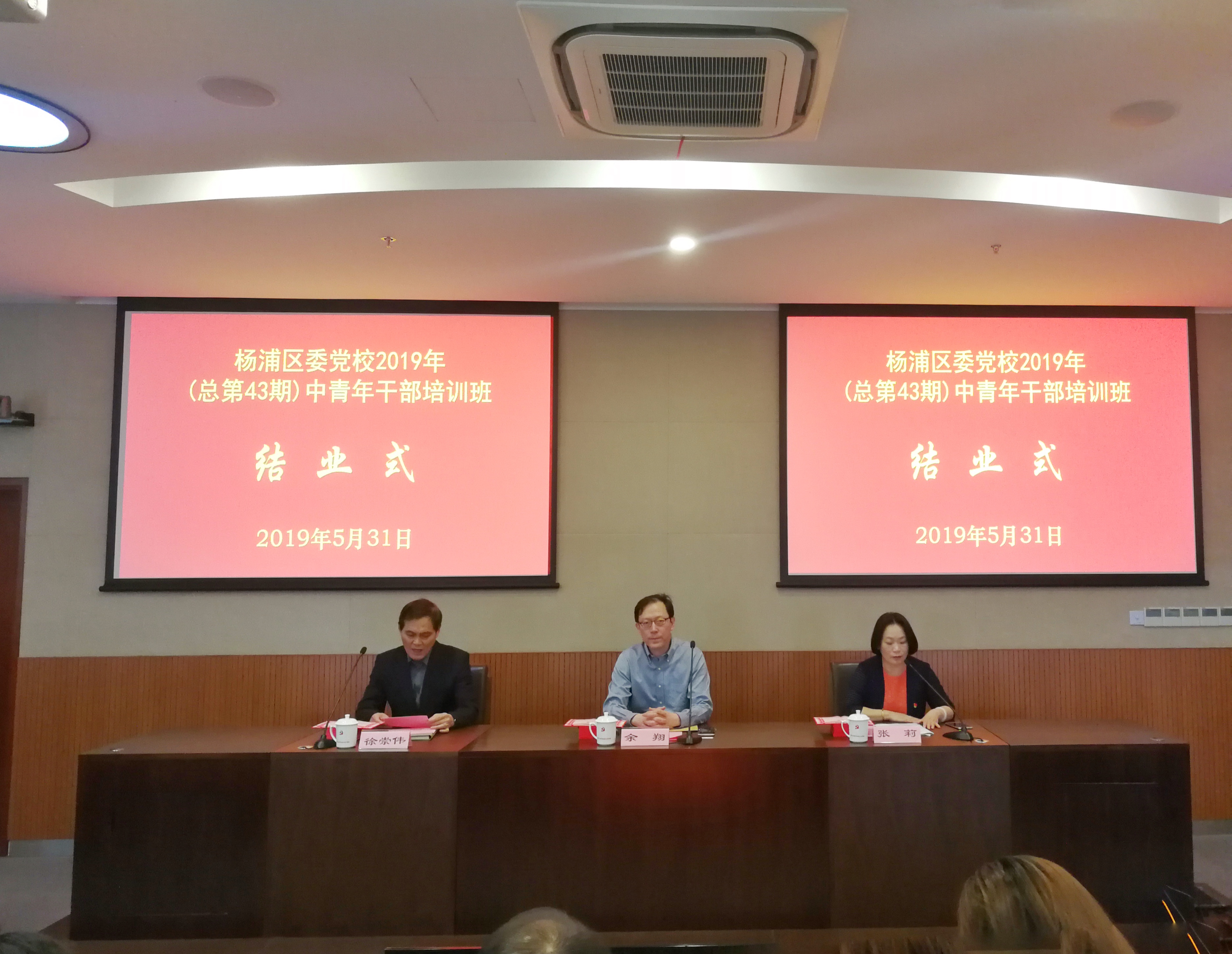 本网讯 5月31日,杨浦区第43期中青年干部培训班在区委党校举行结业式。区委组织部副部长、区编办主任余翔,中青班组织员徐崇伟出席结业式。区委党校常务副校长张莉主持。