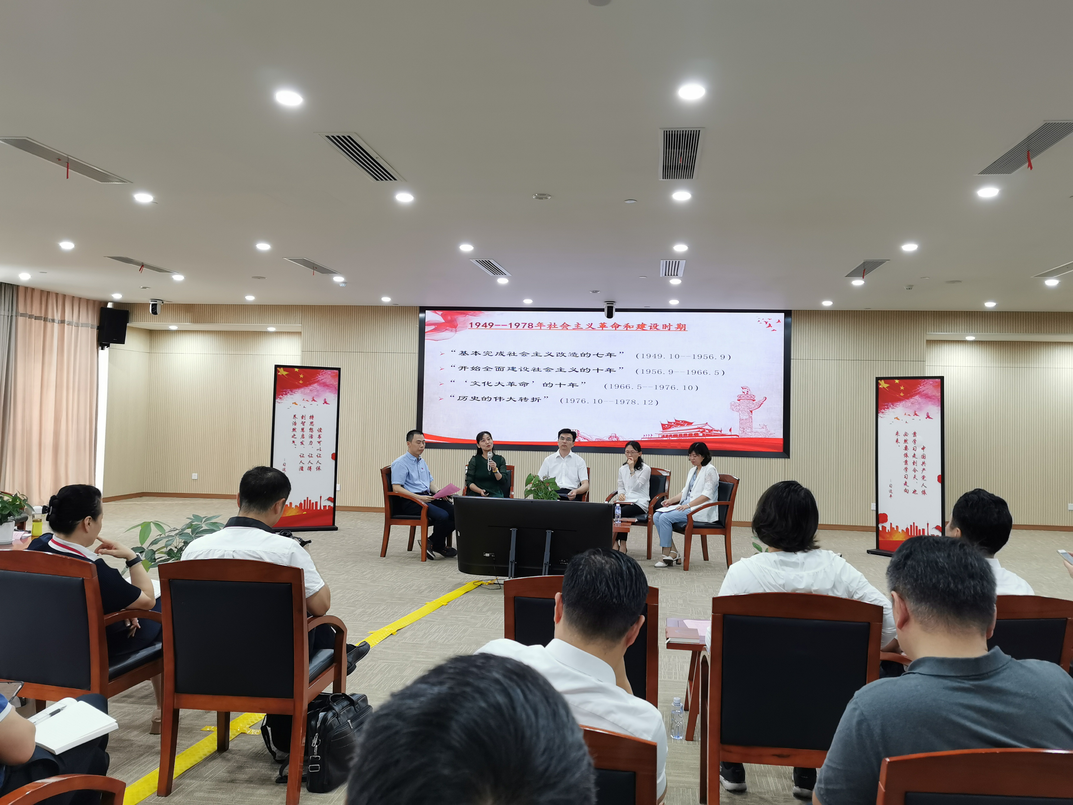 此次读书沙龙活动共分四个板块。第一个板块是由奉贤党校科研部孙彦博士作新中国史导学,第二个板块是由四名学员进行主题发言,第三个板块是全体学员交流讨论,第四个板块是由奉贤党校学员工作部主任、高级讲师康平作点评提升。主题发言的4位学员分别结合社会主义建设时期、改革开放和社会主义现代化建设新时期、中国特色社会主义新时代三个历史阶段的读书学习感悟作交流分享。区水务局党委副书记、副局长石瑛在“曲折中前行 探索中发展”的主题发言中分享了新中国社会主义建设时期的探索历程,老一辈从战场上走来的无产阶级革命者们,在新中国一穷二白的情况下,团结带领全国各族人民艰苦探索,为中国特色社会主义建设奠定了制度基础、物质基础。区地区工作办党组成员、副主任方舟做了题为《改革开放——中国特色社会主义道路的伟大战略》的主题发言,他结合自身经历,为大家回顾了改革开放以来的沧桑巨变。上海开伦造纸印刷集团有限公司副总经理唐广思以“从社会主义市场经济体制的建立过程看中国经济体制改革之路”为题,从理论上梳理了我国社会主义市场经济体制的建立过程,同时也结合自身国企工作实践,探讨了中国经济体制改革之路的探索。金海街道办事处副主任李佳则围绕“建好新时代人民城市 共筑新时代中国梦”的主题,结合自身工作,交流分享对“人民城市人民建 人民城市为人民”这一新时代重要理念的理解认识和实践落实。