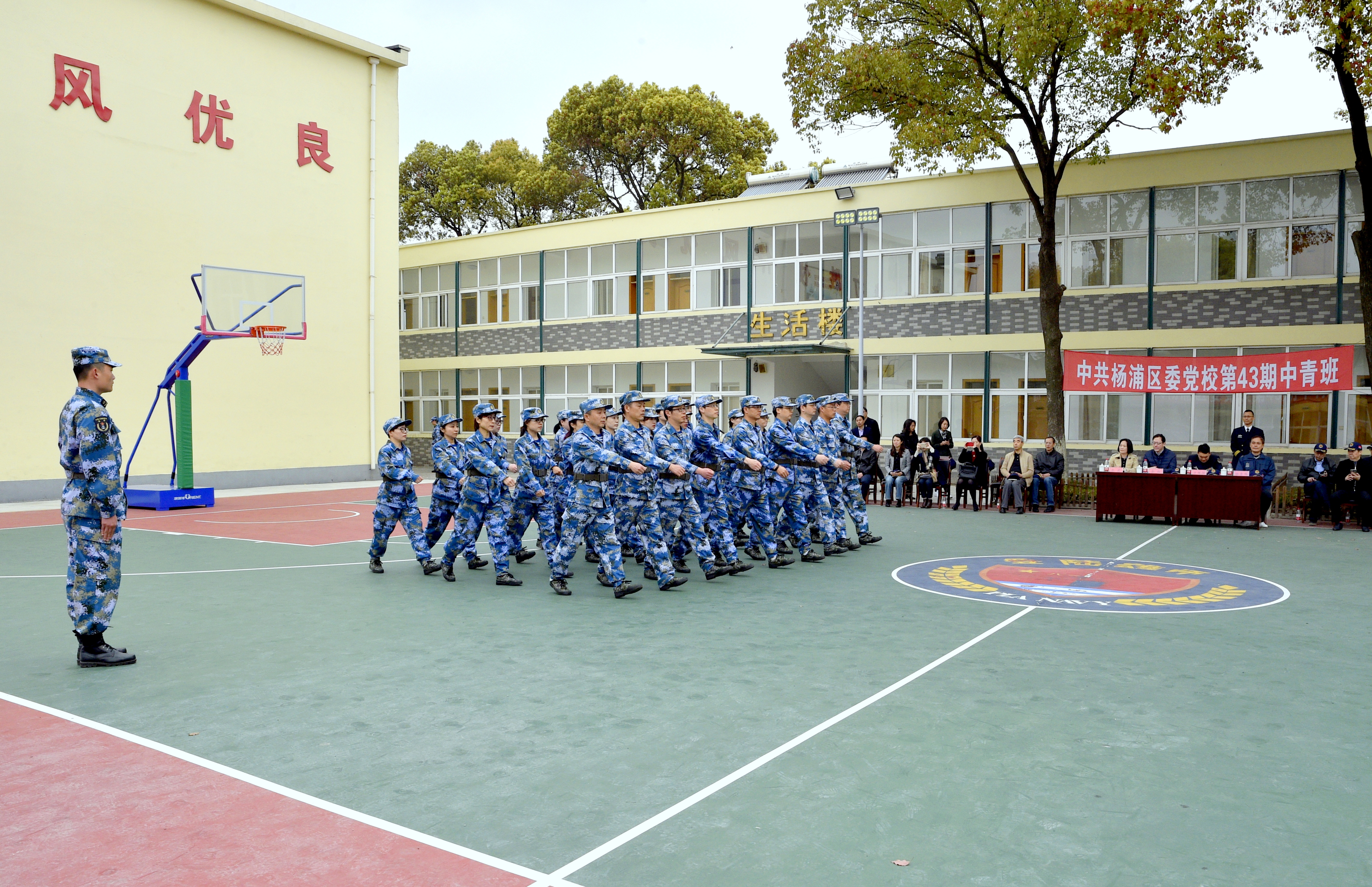 本网讯 4月4日上午,杨浦区第43期中青班军训成果汇报会在东海舰队某支队驻地举行。杨浦区委组织部副部长、区编办主任余翔出席并讲话。杨浦区委党校常务副校长张莉主持。某支队教练舰领导、中青班组织员、中青班学员所在单位领导出席。