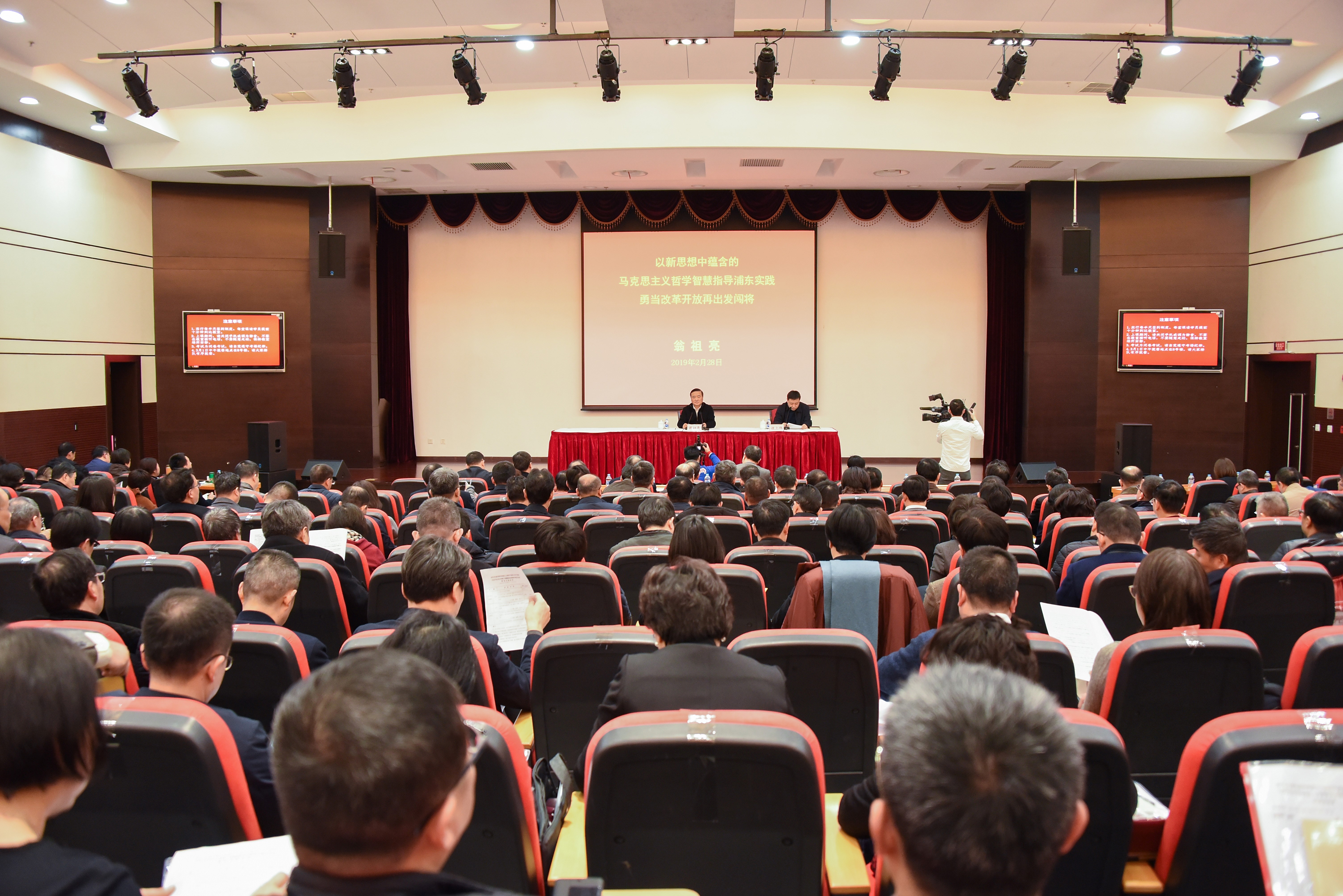 翁祖亮指出,学习贯彻落实习近平新时代中国特色社会主义思想和习近平总书记考察上海重要讲话精神,是浦东当前和今后一段时期最重要的政治任务。贯彻落实新思想和重要讲话精神,不仅要把习近平总书记具体部署要求不折不扣落到实处,更要深刻把握和运用新思想中蕴含的马克思主义哲学智慧来武装头脑、指导实践,不断提高各项工作的系统性、预见性、创造性。他从强化大局意识、深化改革开放、坚持聚焦重点、增强工作实效、服务保障民生等5个方面详细阐述了如何应用马克思主义哲学思维指导工作实践。