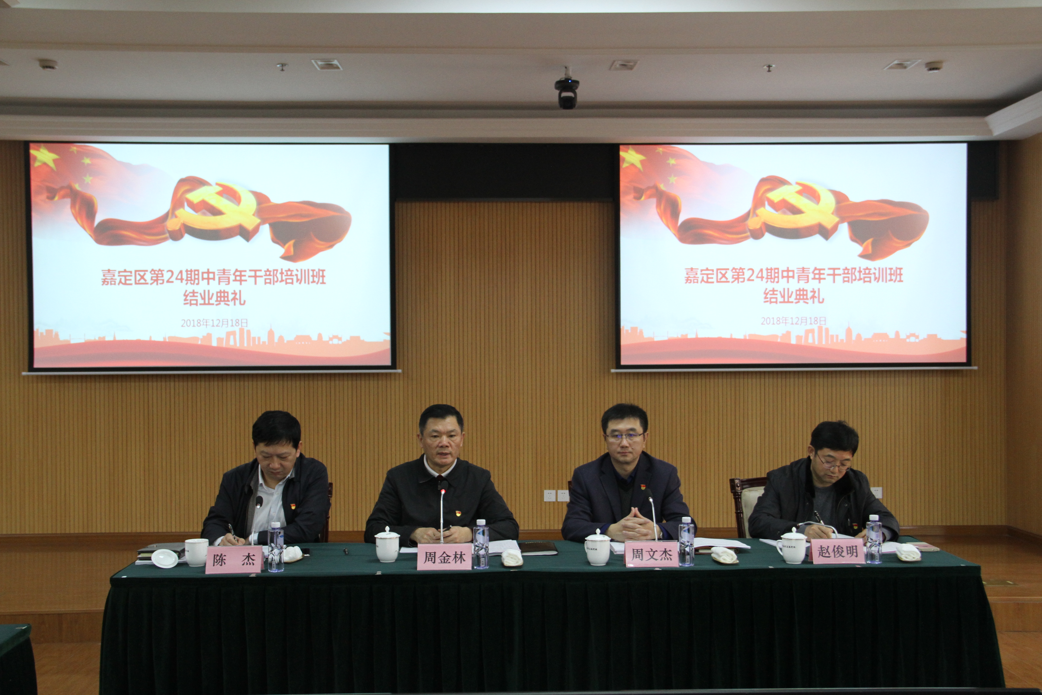 本网讯 12月18日下午,嘉定区第24期中青年干部培训班举行结业典礼。嘉定区委副书记、区委党校校长周金林出席结业典礼并讲话,区委常委、区委组织部部长周文杰宣布优秀学员名单和获奖的社会调研成果。区委组织部副部长陈杰主持了结业典礼,区委党校常务副校长赵俊明出席结业典礼。