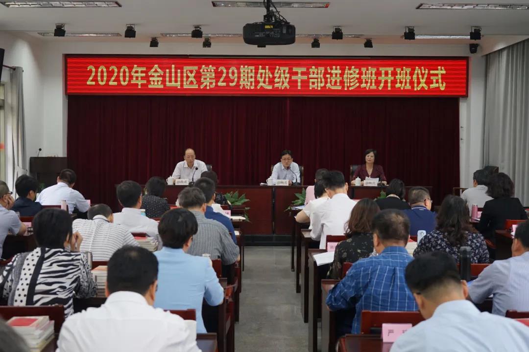 本网讯 6月8日,金山区第29期处级干部进修班在区委党校正式开班。区委常委、组织部部长白锦波出席开班仪式并作动员讲话,区委组织部副部长蒋雅红主持,区委党校常务副校长孙秀强宣读进修班班委会及教学管理项目组成员名单。