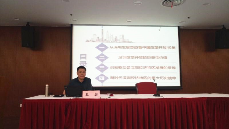 王鑫全面介绍了深圳经济特区的历史沿革、辖区范围、发展现状等基本情况,并从“深圳发展奇迹看中国改革开放40周年”“深圳改革开放的历史性价值”“创新驱动是深圳发展的灵魂”“新时代深圳的重大历史使命”四个方面,深刻阐述了深圳改革开放40年来取得的伟大成就、成功经验和新时代深圳的发展方向。