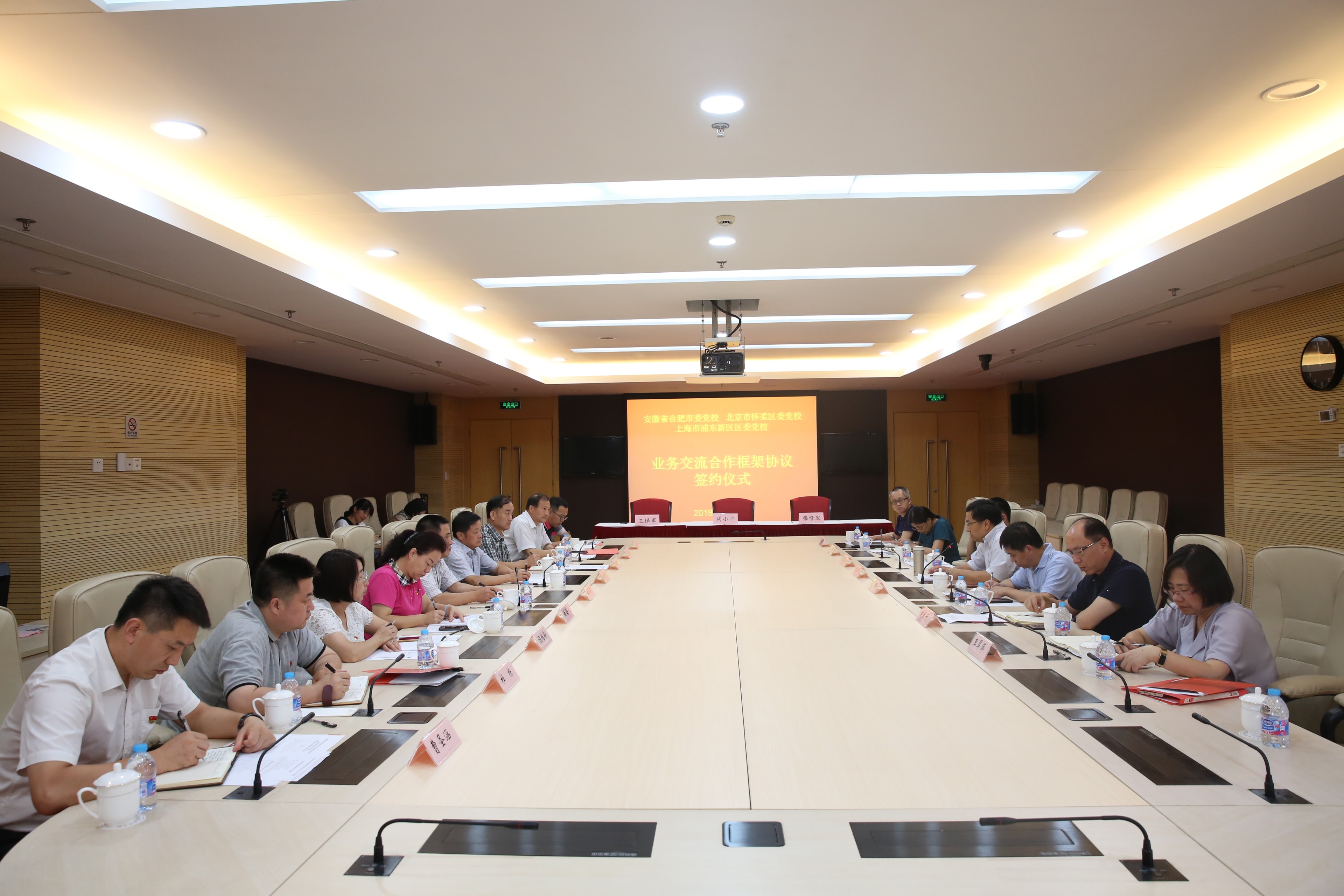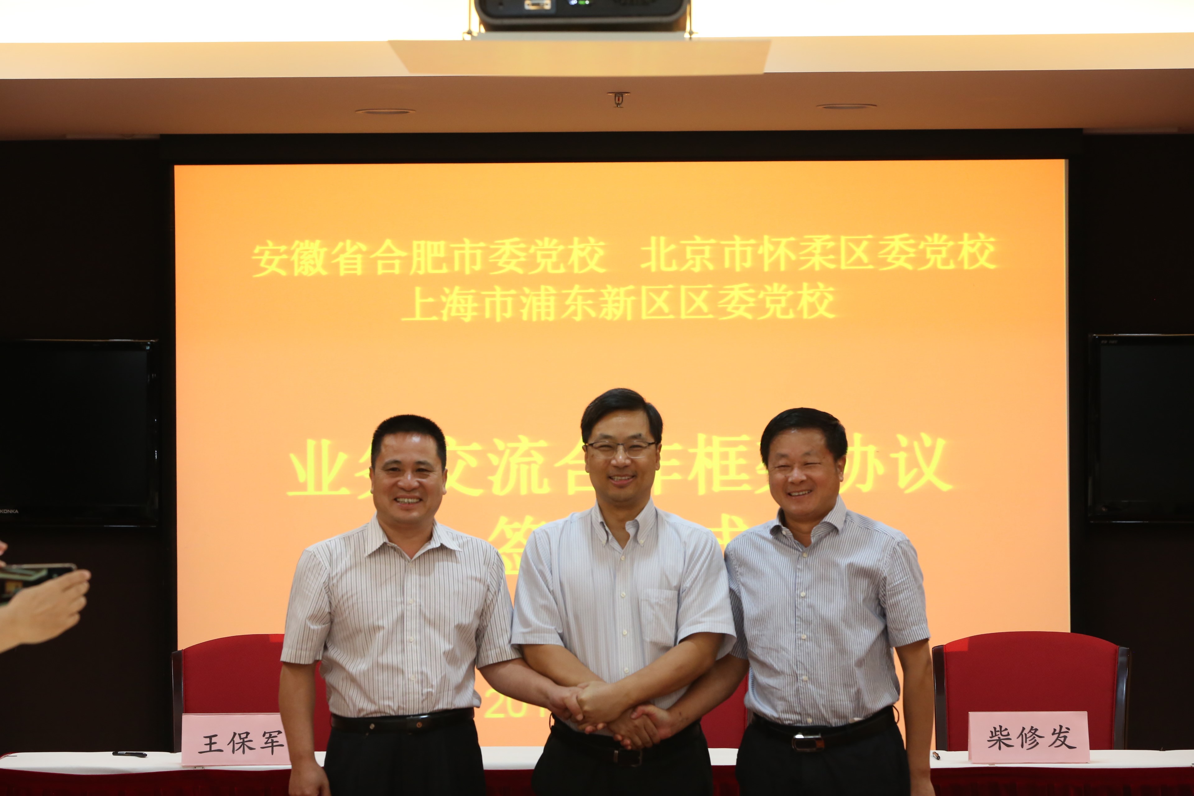 本网讯 为进一步贯彻落实《中共中央关于加强和改进新形势下党校工作意见》,发挥不同区域党校间的优势互补作用,推动优质资源共享,实现合作共赢,助力三地科学城建设和区域创新发展,服务干部成长,7月27日,安徽合肥市委党校、北京怀柔区委党校、上海浦东区委党校在浦东区委党校举行《业务交流合作框架协议》签约仪式。合肥市委党校常务副校长柴修发,怀柔区委党校党委书记、常务副校长王保军,浦东区委党校常务副校长周小平等出席仪式并讲话。浦东区委党校副校长阴群主持。