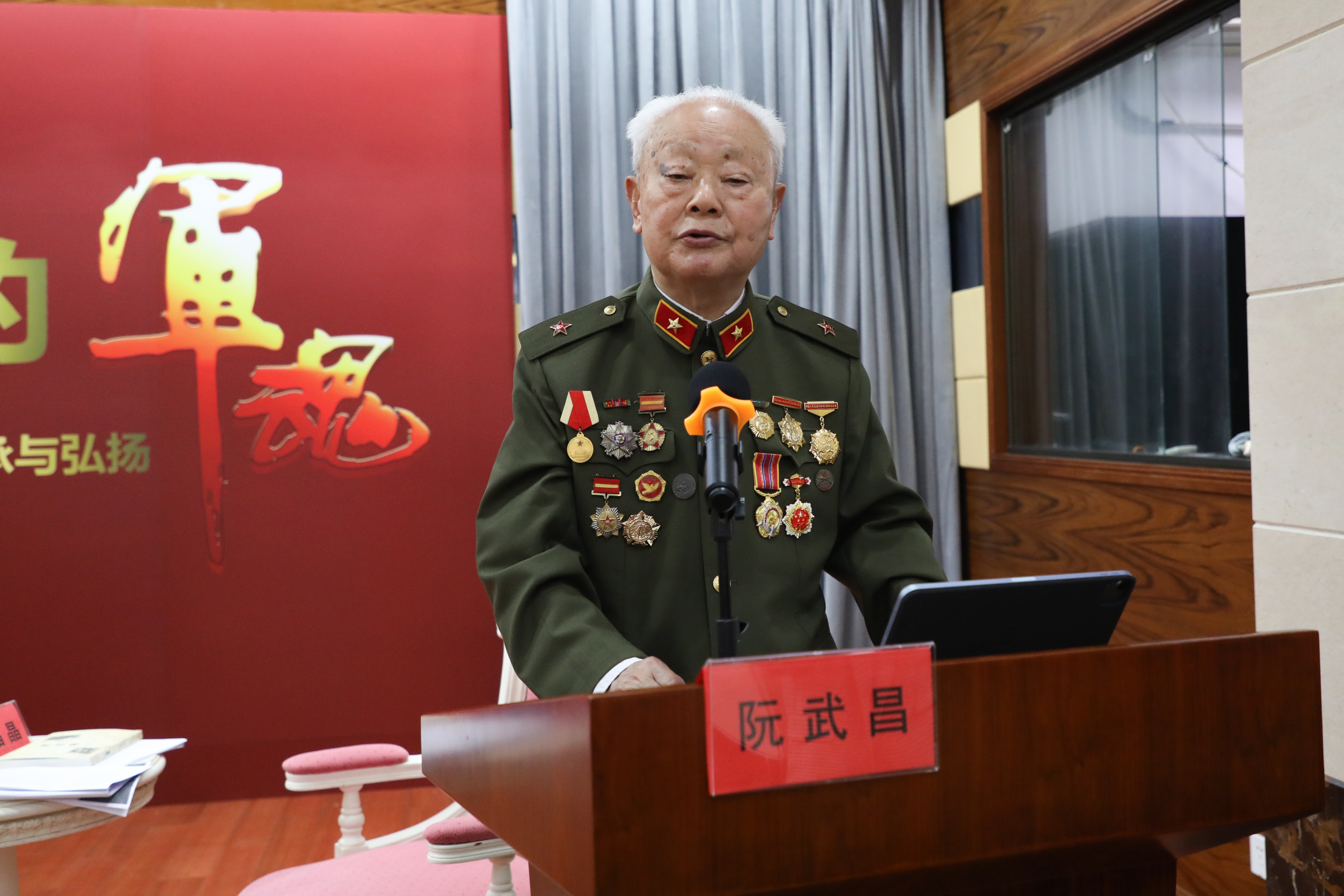 阮武昌老先生婉拒了提前准备好的沙发,坚持站着讲了整整一个小时。他从三个方面总结了自己参加革命斗争的体会:一是如果没有中国共产党的英明领导,就绝不会有中国今天的一切;二是如果没有广大革命志士的艰苦奋战特别是先烈们的英勇牺牲,也绝不会有中国今天的一切;三是如果没有人民群众全心全意的拥护和支持,也绝不会有中国革命的胜利。他所讲的发生在战场上的感人事迹令在场所有人为之动容。例如,他第一次接到负责掩埋烈士遗体任务时,看到的都是二十岁不到的小伙子,有些脸还是娃娃脸。他说:“战争中经常会出现这样的情形,几个小时前,我还在跟战友们一起吃晚饭,几个小时后,他们便牺牲在了前线……”
