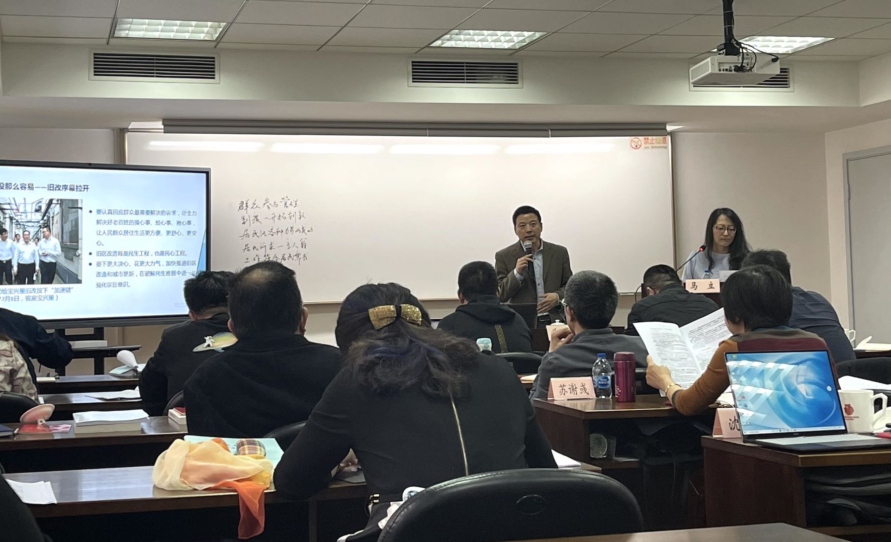 课间,在黄浦工作、了解旧改且有切身体验的近一半学员深入参与案例的研讨交流,大家深入剖析宝兴里创造“双百奇迹”的原因、社会治理的智慧和策略,增强了要始终坚持“人民城市人民健,人民城市为人民”重要理念的政治自觉和行动自觉。学员们纷纷以宝兴里居委创造的“五心精神”——“树立恒心耐心决心虚心雄心的工作精神”为上联,对出了“永葆亲民爱民为民惠民利民的公仆情怀,情暖民心”“架起温情友情亲情真情激情的沟通桥梁,有心有情”“建设民立民健民和民乐民享的爱心家园,一切为了人民”等精彩下联与横批,表示要站在时代高度思考人民城市的理论维度,强化党建引领,突出用心用情,倾心倾力、务实创新,把群众路线走实走好,更好地实现“城市,让生活更美好”。