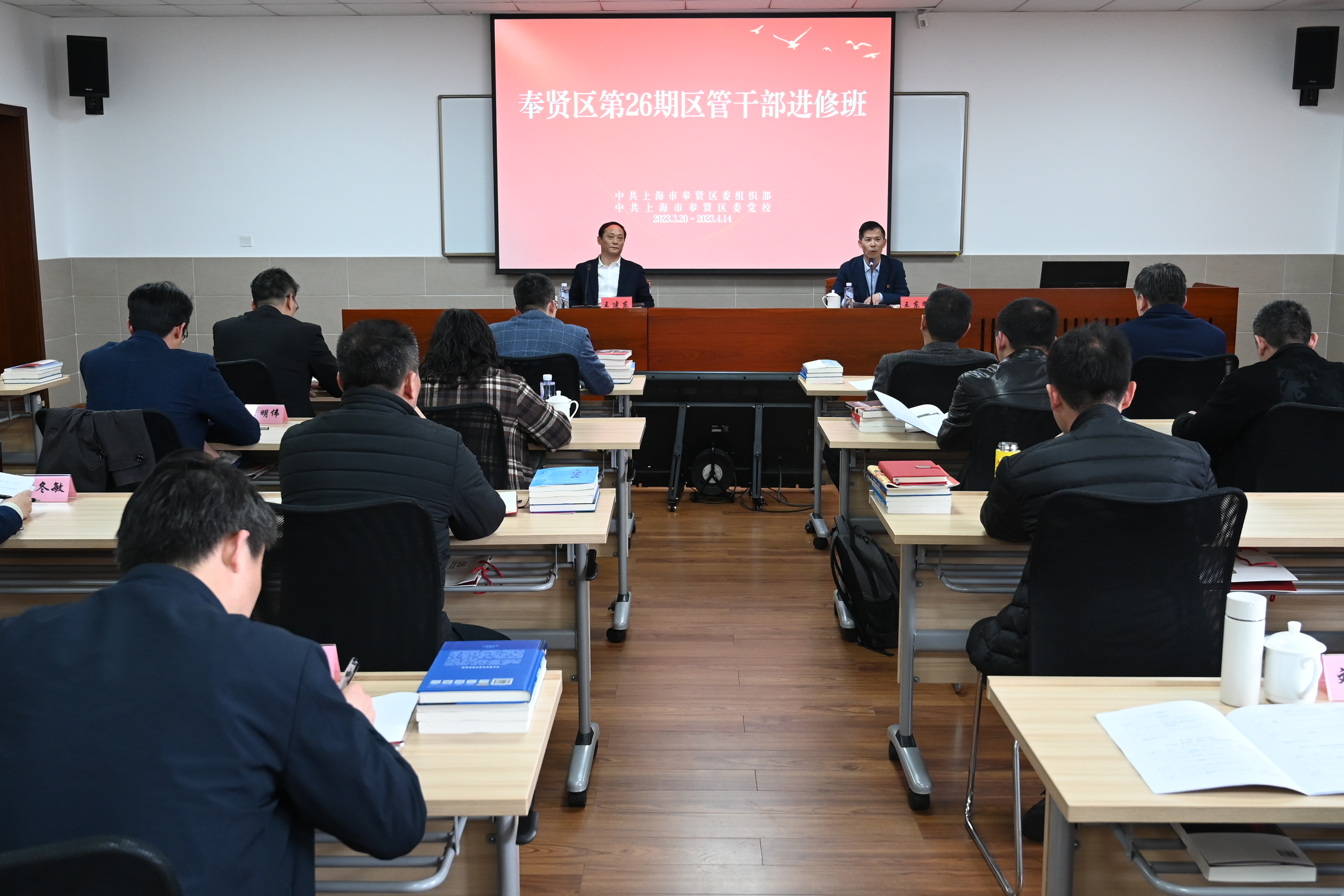 本网讯 4月4日,奉贤区委常委、副区长王建东应邀为区第26期区管干部进修班作《奉贤乡村振兴高质量发展》专题辅导。奉贤区委党校副校长王东辉主持。