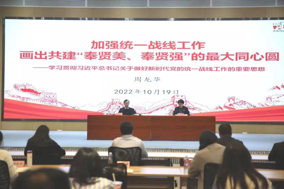 本网讯 10月19日下午,奉贤区委常委、统战部部长周龙华应邀为奉贤区第25期区管干部进修班和第16期中青年干部培训班的全体学员作《加强统一战线工作,画出共建“奉贤美、奉贤强”的最大同心圆——学习贯彻习近平总书记关于做好新时代党的统一战线工作的重要思想》专题辅导。奉贤区委党校常务副校长王秋萍主持。