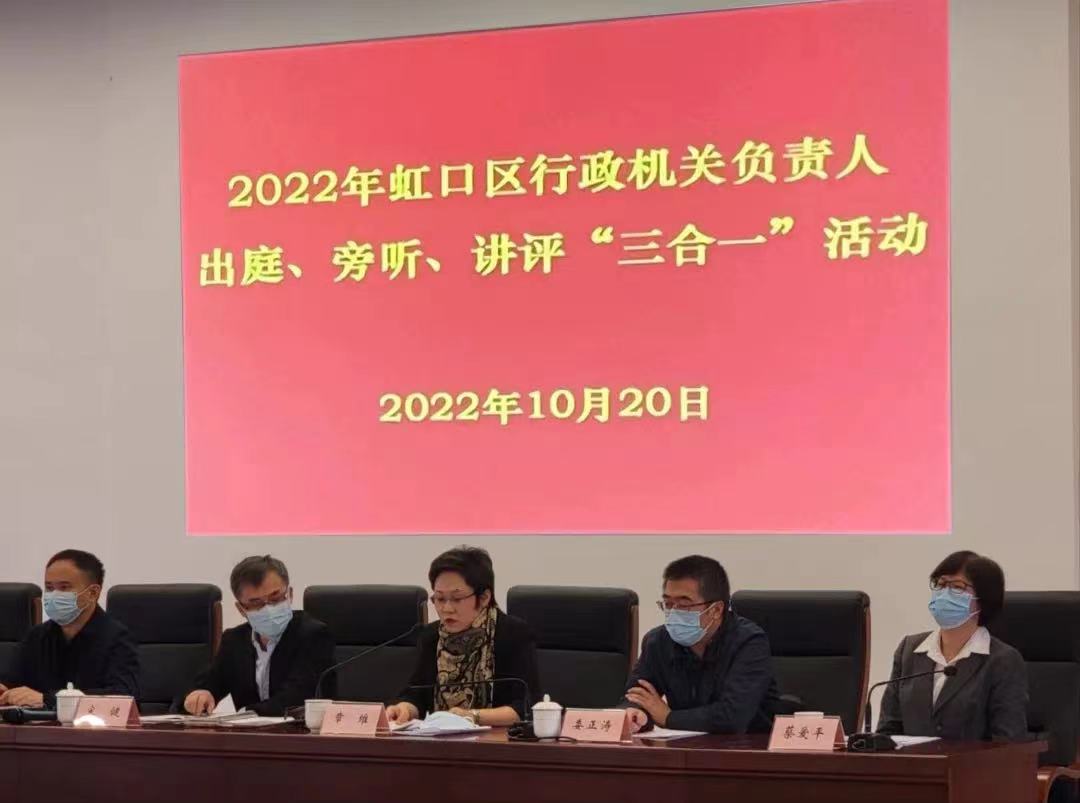 本网讯 为深入贯彻落实习近平法治思想,提高领导干部法治教育成效,提升党校法治教育培训效果,10月20日上午,2022年虹口区行政机关负责人出庭、旁听、讲评“三合一”活动在区委党校举行。副区长章维出席并讲话,市司法局行政应诉与协调处处长、二级巡视员宋健,市委党校副教授蔡爱平作案件点评。区住房保障和房屋管理局副局长、二级巡视员杨叶盛,上海铁路运输法院副院长娄正涛,区委党校常务副校长温美平,上海铁路运输法院行政庭庭长沈洁出席活动。活动由区司法局党委书记、局长王琳主持,2022年虹口区处级干部进修班全体学员50余人参与活动。