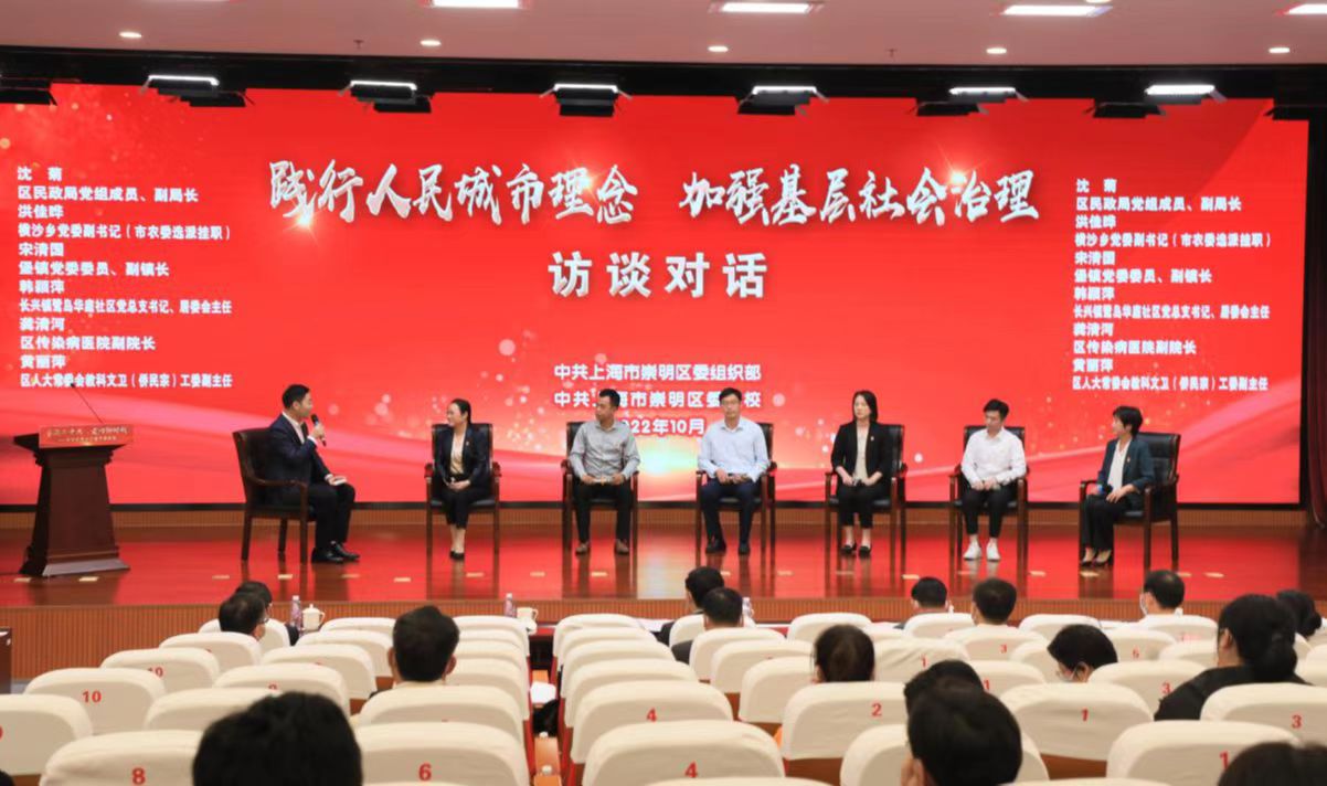 论坛特设访谈对话环节,区委党校教研室主任张林作为主持人,邀请区民政局党组成员、副局长沈菊,横沙乡党委副书记洪佳晔,堡镇党委委员、副镇长宋清国,长兴镇鹭岛华庭居民区党总支书记韩颖萍,区传染病医院副院长龚清河,区人大常委会教科文卫(华侨民族宗教)工委副主任黄丽萍等六位嘉宾,围绕“践行人民城市理念 加强基层社会治理”,开展访谈交流,碰撞思想火花。