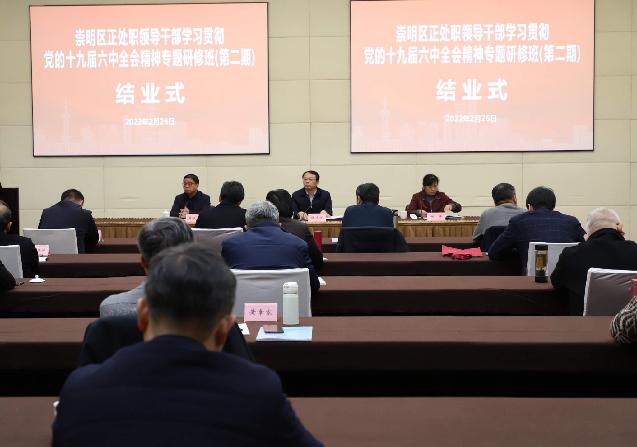 本网讯 为进一步深化领导干部对党的十九届六中全会精神的理解领悟,推动崇明世界级生态岛建设取得突破性进展,2月21日至26日,崇明区正处职领导干部学习贯彻党的十九届六中全会精神专题研修班分两期在市委党校集中培训。2月26日下午,第二期培训班举行结业式,崇明区委常委、组织部部长陆志斌和市委组织部干部教育处处长洪峰作结业讲话。市委党校二级巡视员吴从环主持结业式。来自全区区委工作部门正职、乡镇长等42名领导干部参加结业式。
