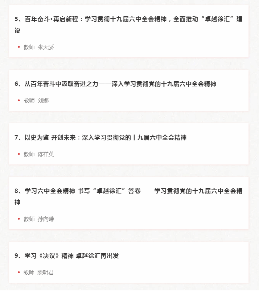 为深入学习宣传贯彻党的十九届六中全会精神,教育引导徐汇区党员干部坚定理想信念、筑牢初心使命,自觉把思想和行动统一到全会精神上来,统一到新征程创造新奇迹、展现新气象的奋斗上来,统一到全面建设“卓越徐汇”的奋斗目标上来,区委党校推出“学习贯彻党的十九届六中全会精神”专题课程清单。内容如下:(见图片)