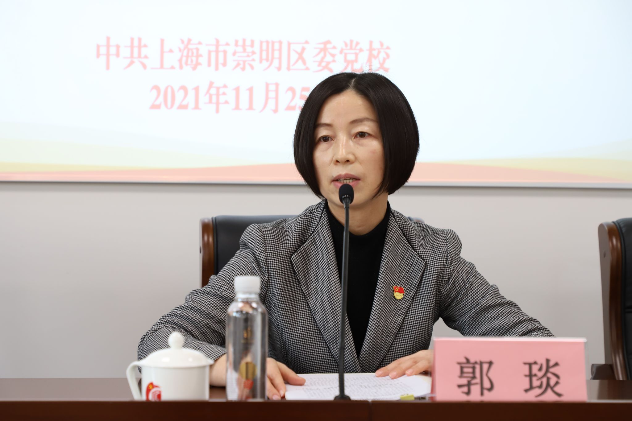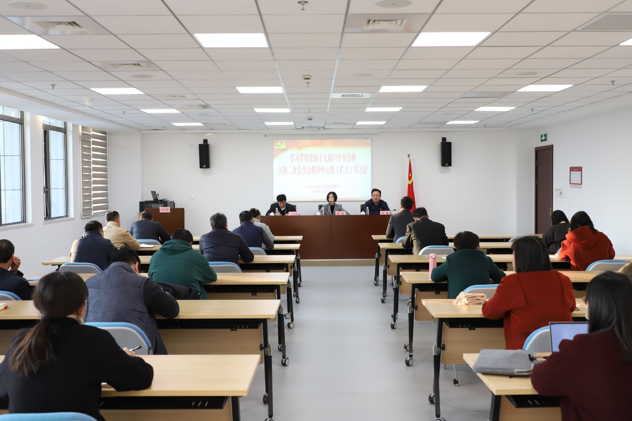 本网讯 11月25日下午,崇明区委党校召开学习贯彻党的十九届六中全会和崇明区第二次党代会精神中心组(扩大)学习会,常务副校长郭琰主持会议,全体教职工参加会议。