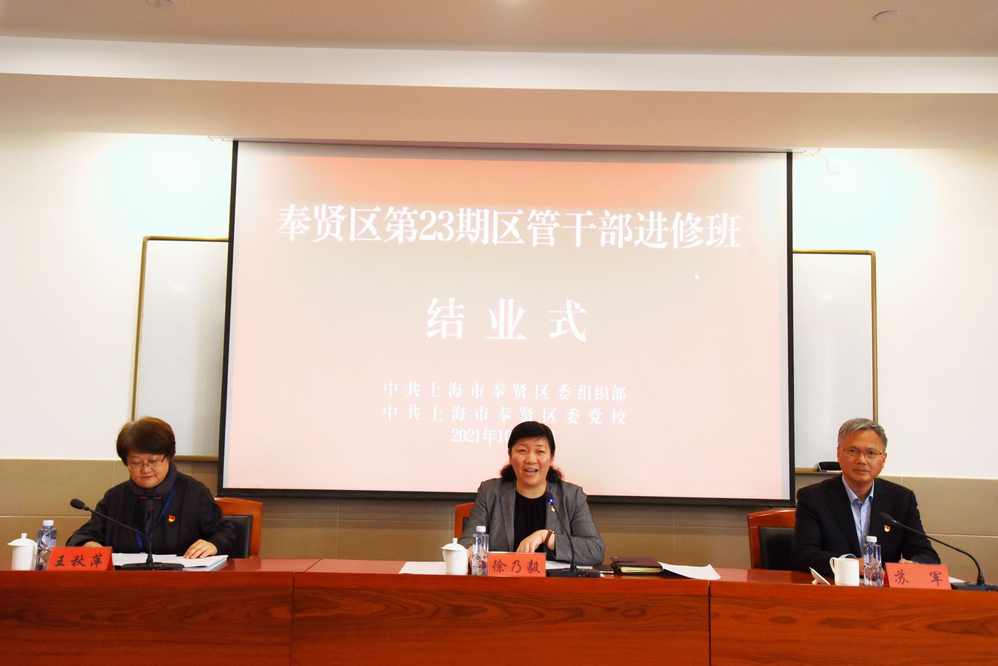 本网讯 10月25日下午,奉贤区第23期区管干部进修班在区委党校举行结业式。奉贤区委组织部部长、区委党校校长徐乃毅出席仪式并讲话,区委组织部常务副部长苏军参加结业式,区委党校常务副校长王秋萍主持。