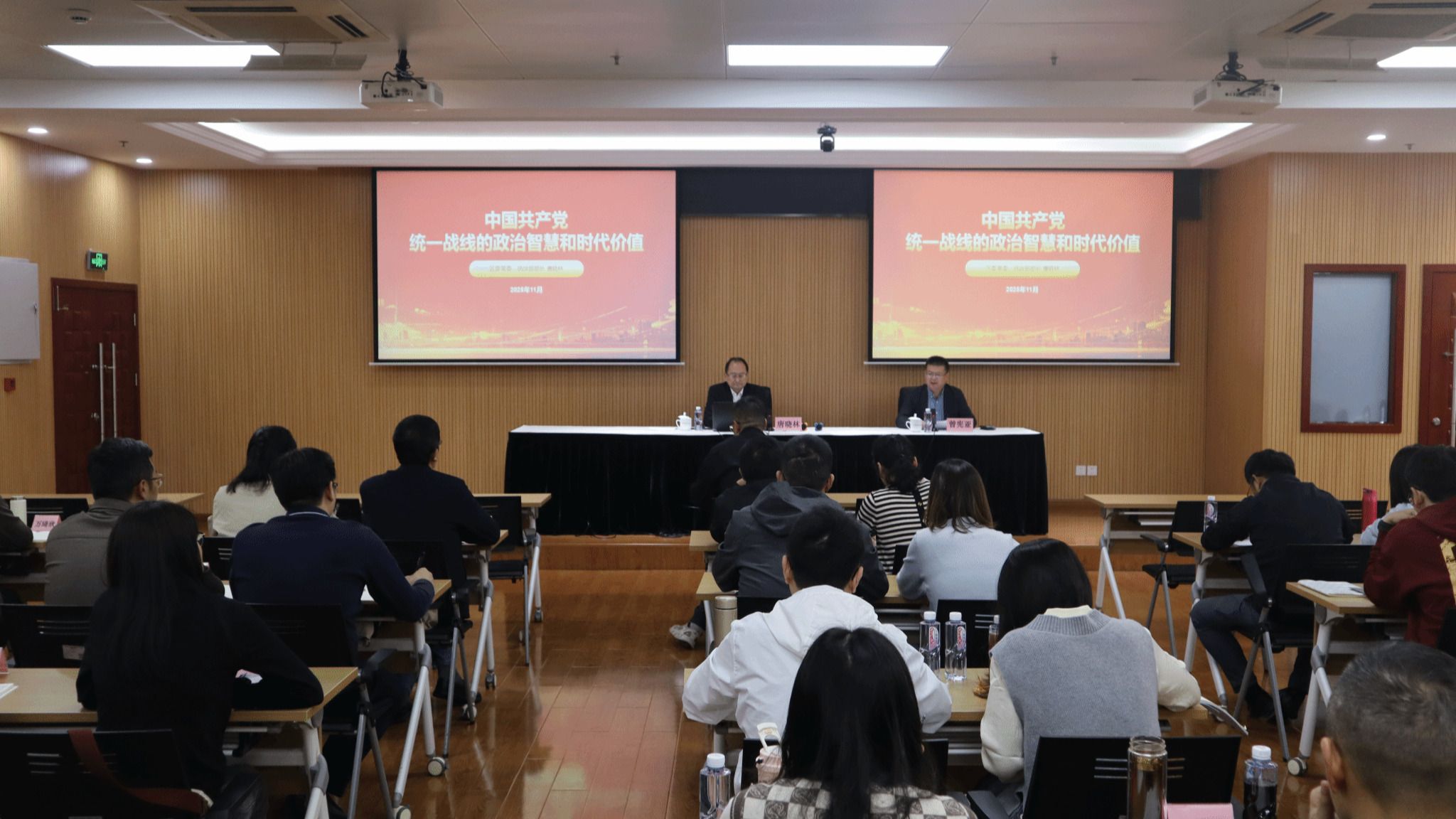 唐晓林围绕“中国共产党统一战线的政治智慧和时代价值”与“中华民族共同体意识与国家安全”两个主题,进行了深入浅出的讲解。他特别强调新时代爱国统一战线的“12个必须”要求,细致剖析我区在民主党派建设、新阶层人士引领、民族团结进步、民营经济赋能等领域的创新实践及取得的丰硕成果,展现了嘉定统战工作“大团结大联合”的生动局面。