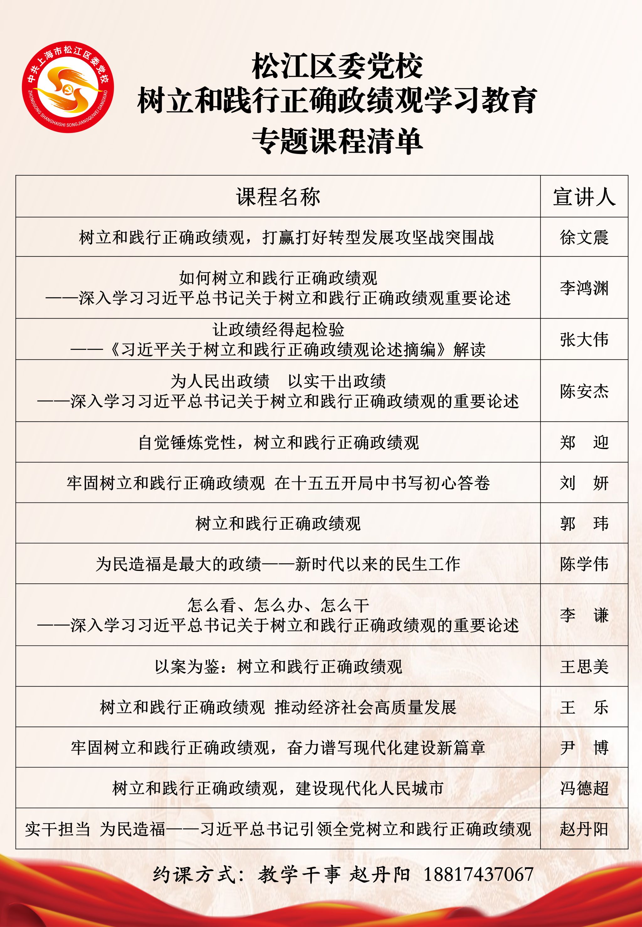 为深入学习贯彻习近平总书记关于树立和践行正确政绩观的重要论述,充分发挥党校理论宣传主渠道主阵地作用,松江区委党校现推出“树立和践行正确政绩观学习教育”专题课程清单,欢迎各单位预约点课。具体课程如下: