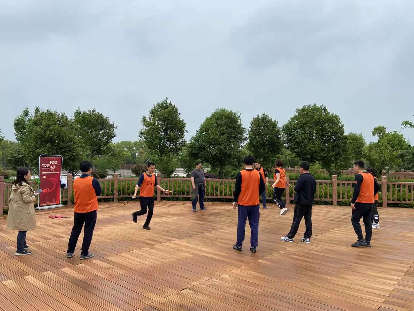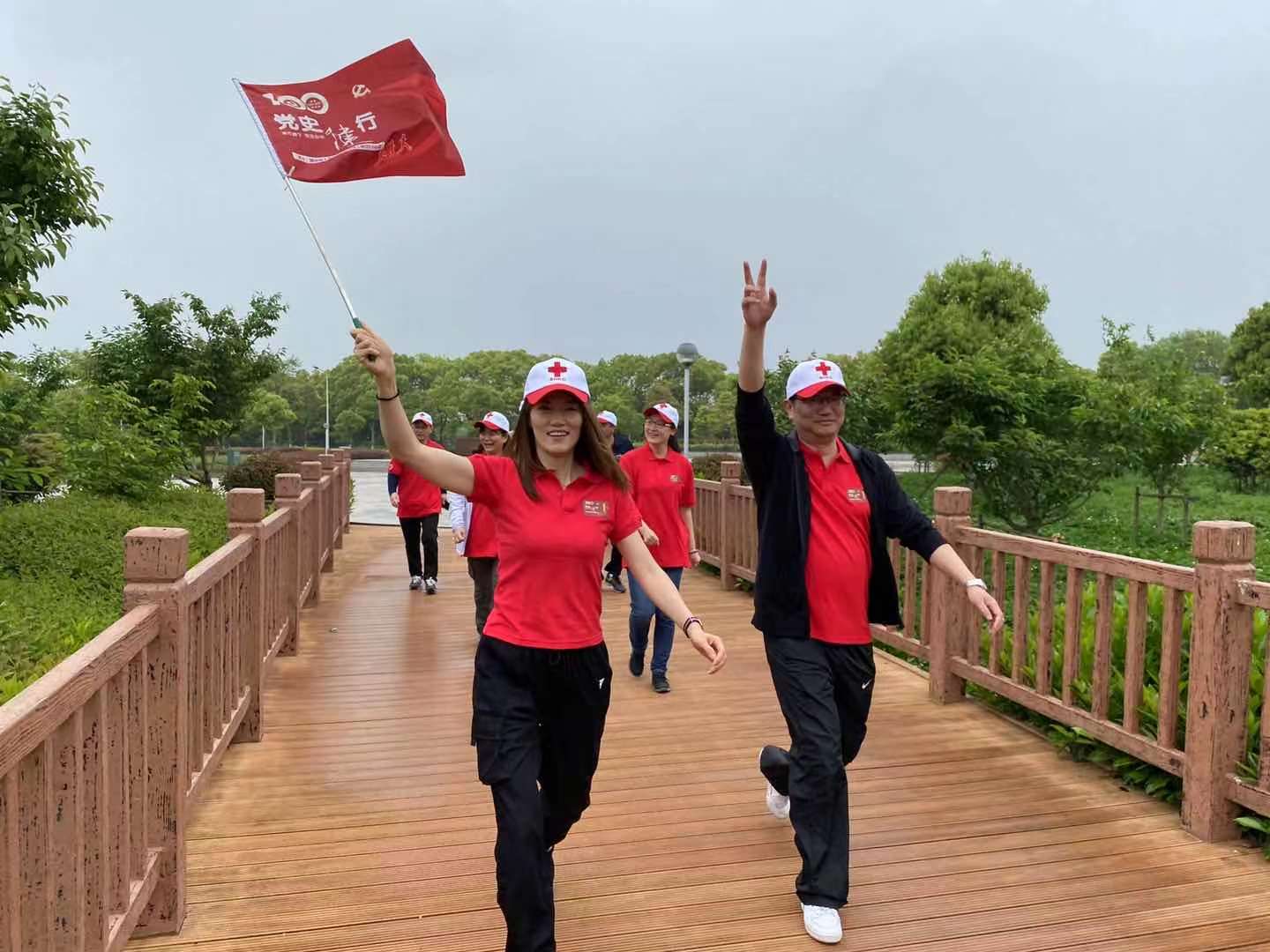 9时整,随着一声号令,6支参赛队按抽签顺序依次出发。健行路线以淀山湖生态园入口广场为起点,沿湖滨步道至彩虹桥,全程约3千米。为展现各队团队精神,沿途设置趣味健身、团队造型、党史问答等4个任务点。为激励学员斗志、争取优异成绩,各参赛队纷纷高喊口号,奋力奔向终点。“闪闪红星,砥砺前行!”“星火星火,冠军是我!”“蓝之梦,中国梦!”“小四小四,向前冲刺!”“五组五组,英明神武;五组五组,藏龙卧虎!”“陆行健行,唯我最行!”,响亮的口号此起彼伏、响彻湖畔。
