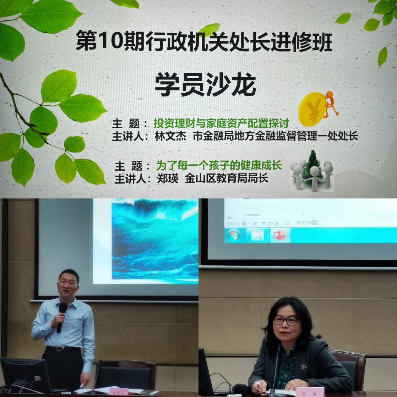 沙龙分为家庭理财和孩子教育两个主题,在班委生活组的组织下,来自市金融局地方金融监管一处的林文杰同学围绕“投资理财与家庭资产配置探讨”,从“为什么要重视投资理财”“家庭资产配置的思路建议”两个方面作了精彩的分享。来自金山区教育局的郑瑛同学围绕“为了每个孩子的健康成长”,从“中考改革总方案的解读”“教育八字口诀”两个方面作了专业的讲解。学员们纷纷表示,本次学员沙龙精准贴近需求,整场活动氛围轻松、互动热烈,信息量大,受益匪浅!