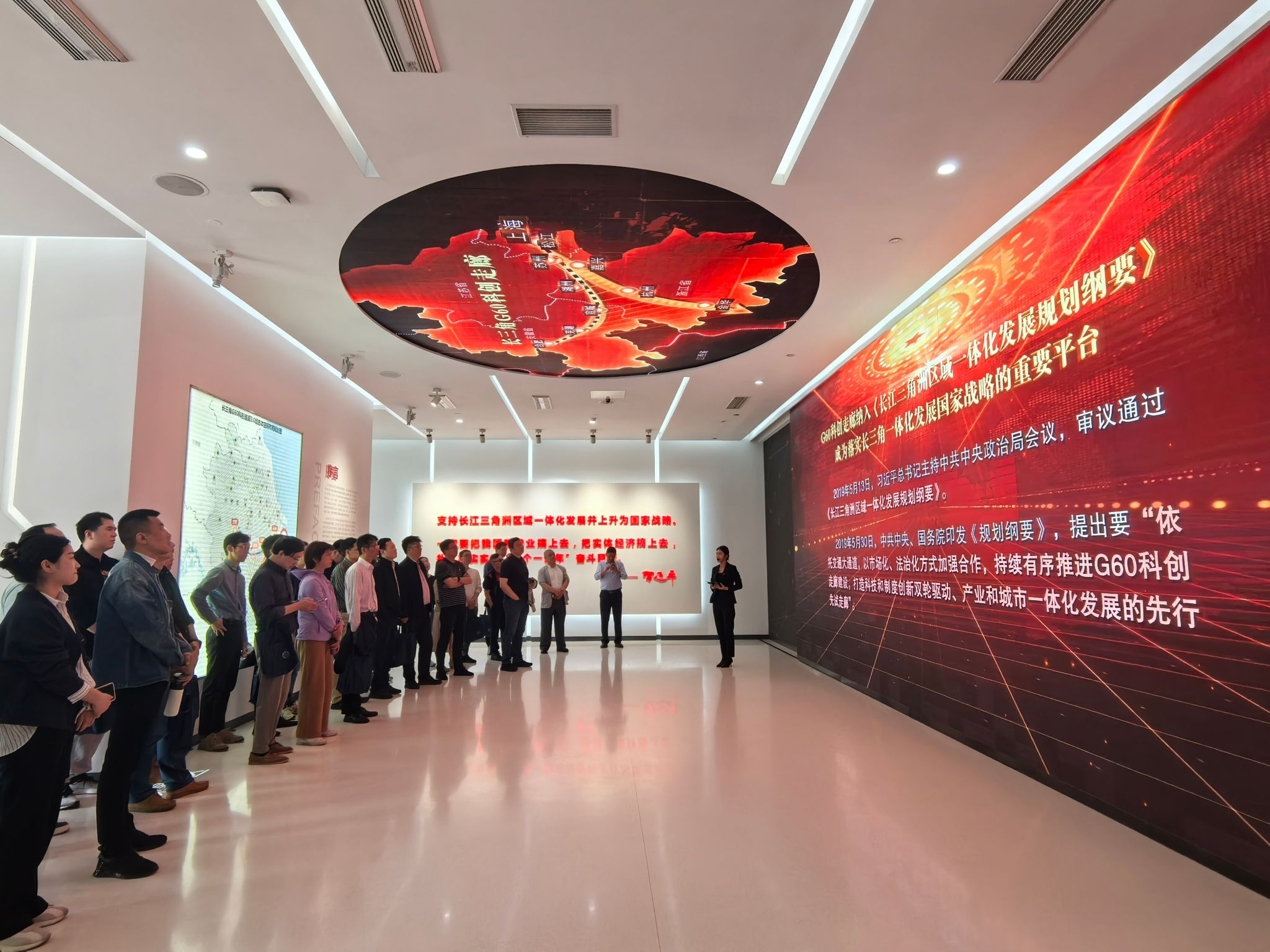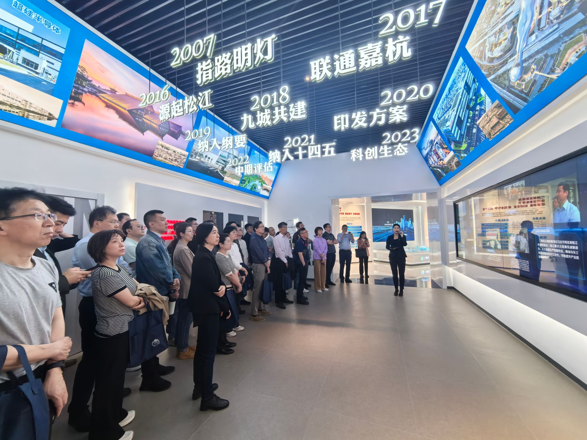 在规划展示馆,学员们在讲解员带领下,通过飞屏、折叠屏、全息膜成像等数字化特色展项以及140余种科创成果实物,全面回顾了G60科创走廊从1.0版的“源起松江”到3.0版的“九城共建”的发展历程。展示馆内,集成电路、生物医药、人工智能等战略性新兴产业的集群化展陈,引起了学员们的浓厚兴趣和驻足观看。